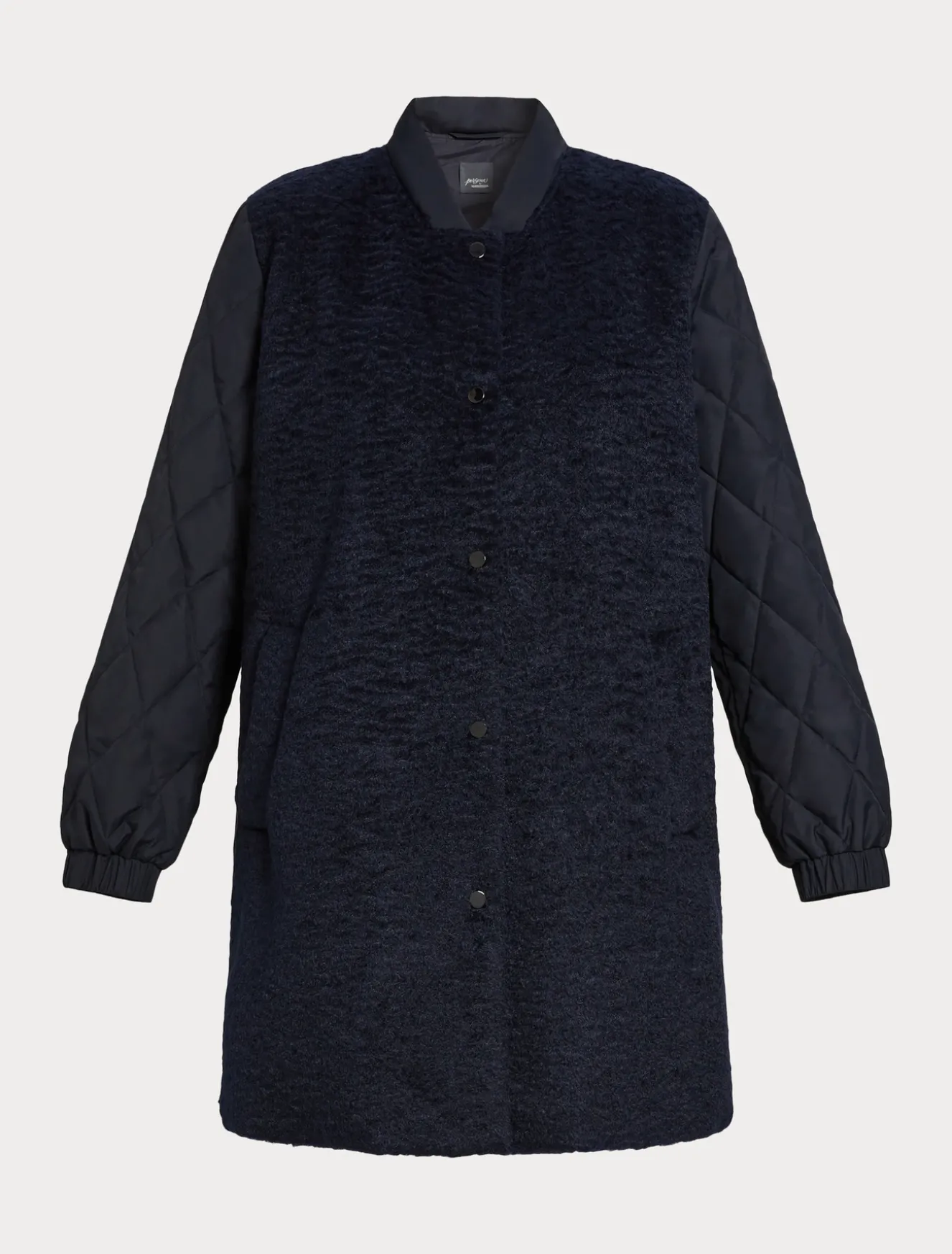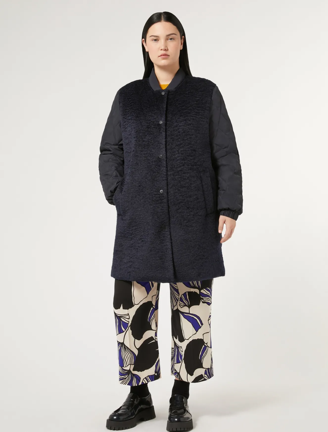 Ispirazioni bomber per la giacca in jersey fluffy e tela antigoccia. Collo e maniche con elastico richiamano ad atmosfere college rivisitate in volumi contemporanei. Il capo fa parte della collezione Persona by Marina Rinaldi.