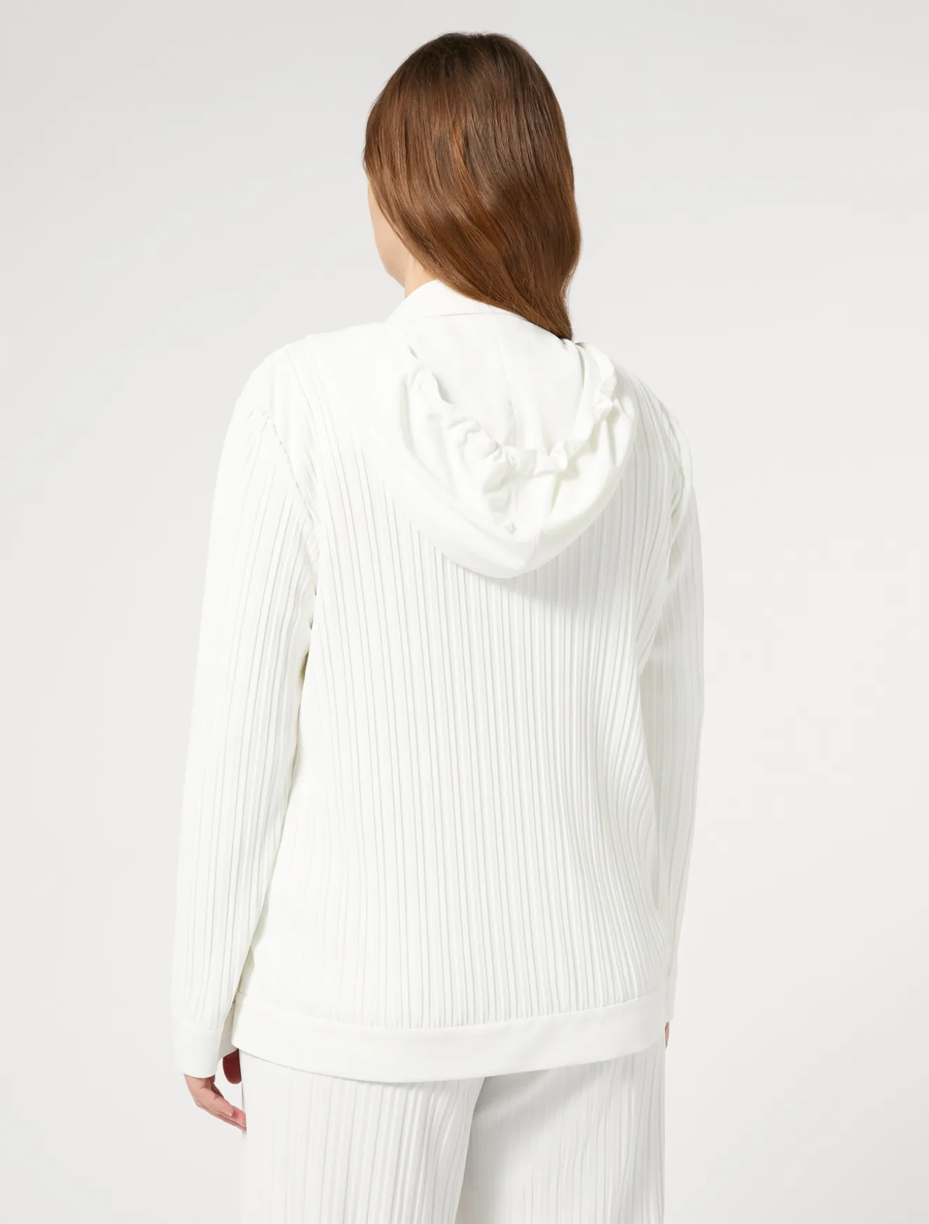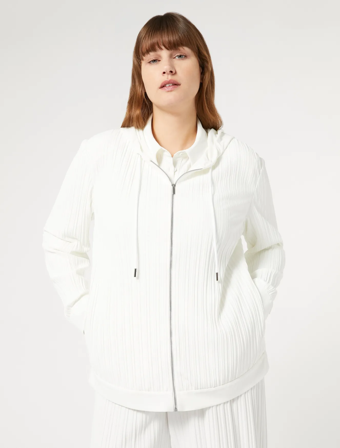 Morbido jersey plissé per la giacca rifinita in jersey unito. La puoi indossare anche in abbinamento ai pantaloni in coordinato.Il capo fa parte della collezione Voyage Relax.
