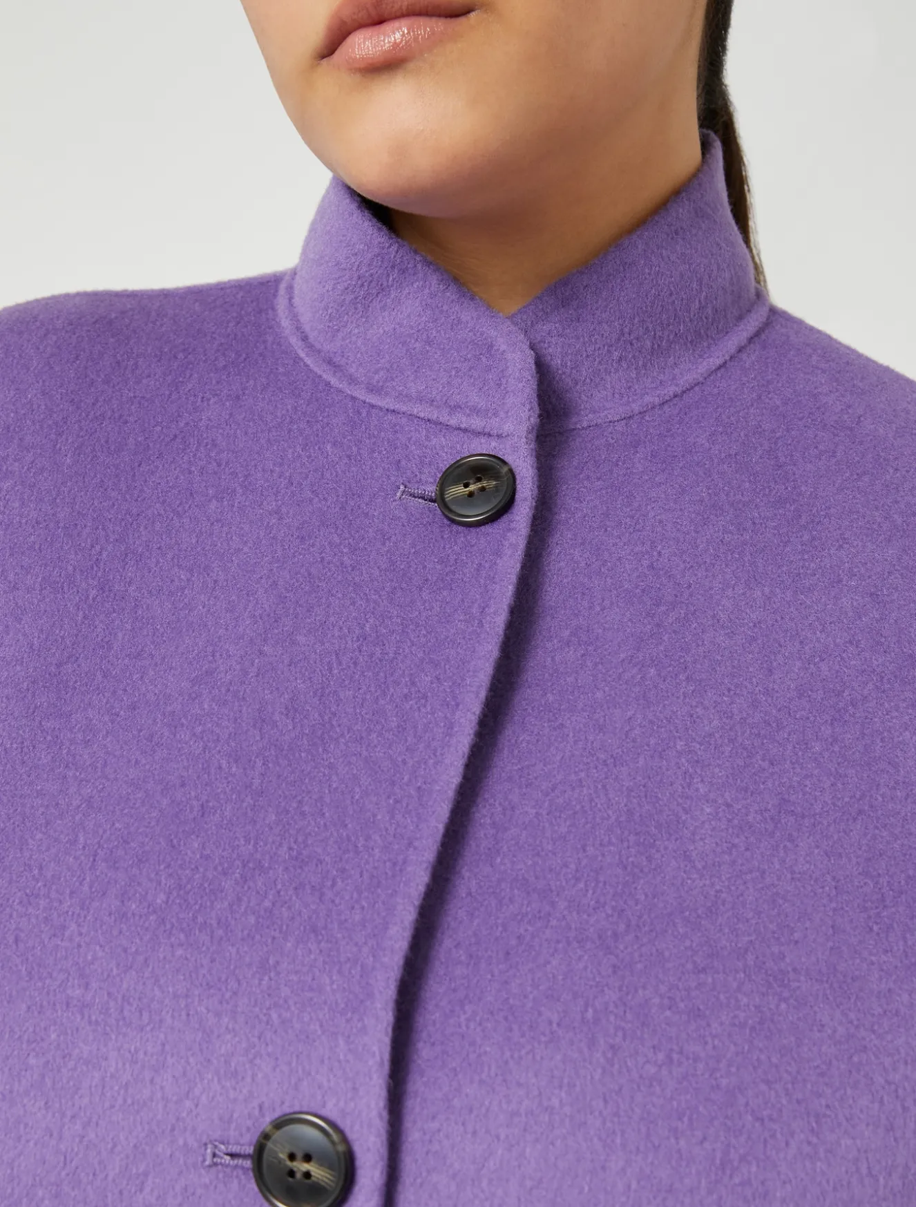 In città o in viaggio, sarà indispensabile il giaccone in double di lana cucito a mano con collo ad anello e maniche lunghe. Le tasche con patta regalano un tocco extra di comfort.Il capo fa parte della collezione Persona by Marina Rinaldi.