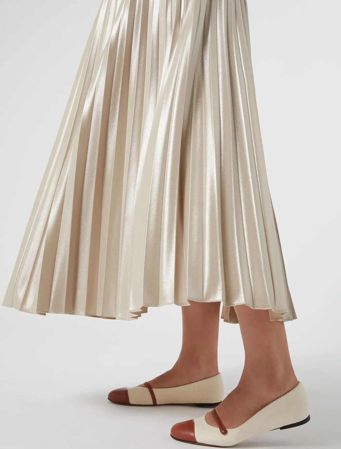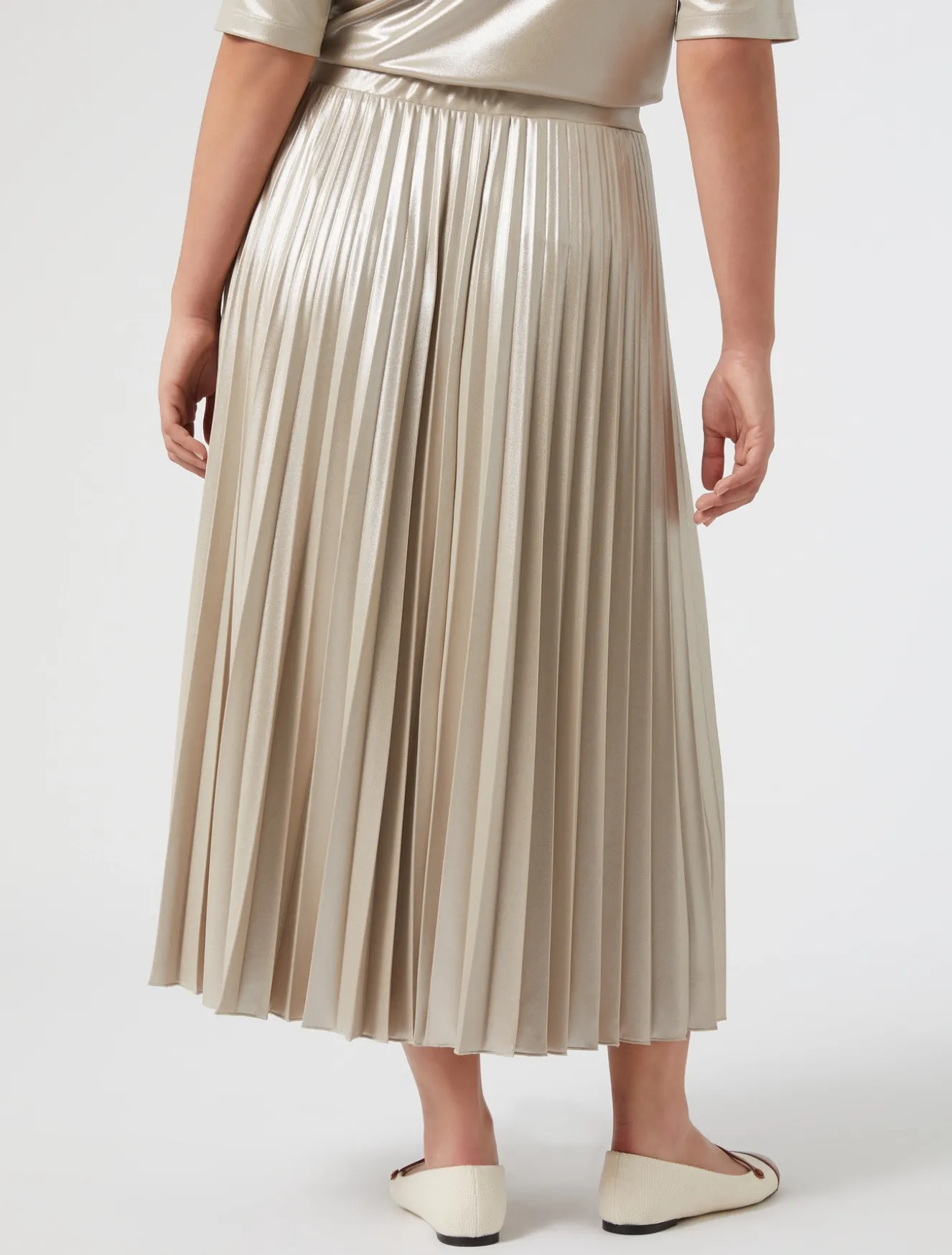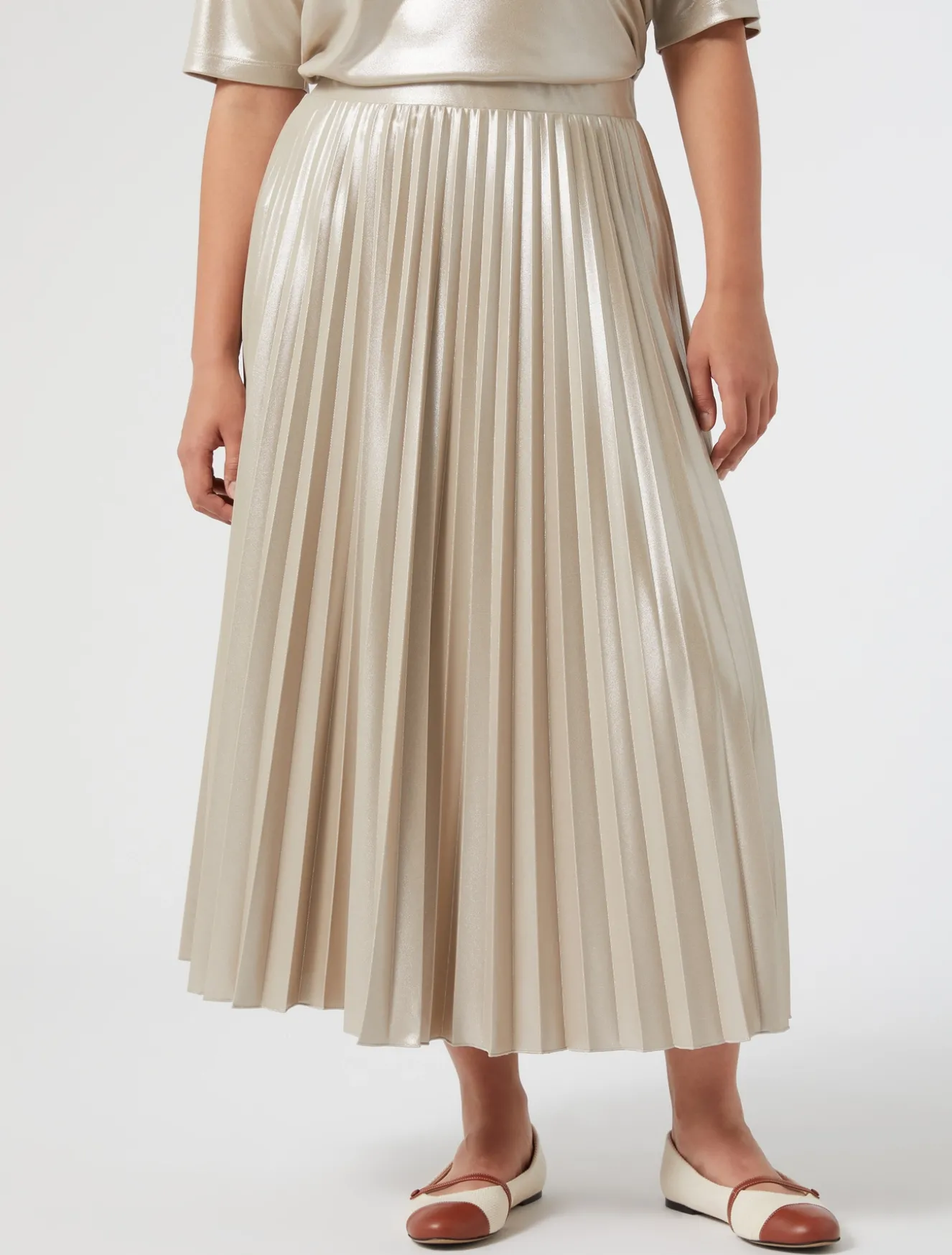 Lavorazione plissé per la gonna in jersey laminato con elastico in vita. Da indossare in un attimo, per elevare qualsiasi look.