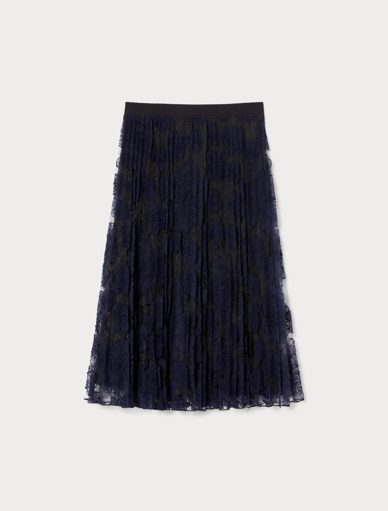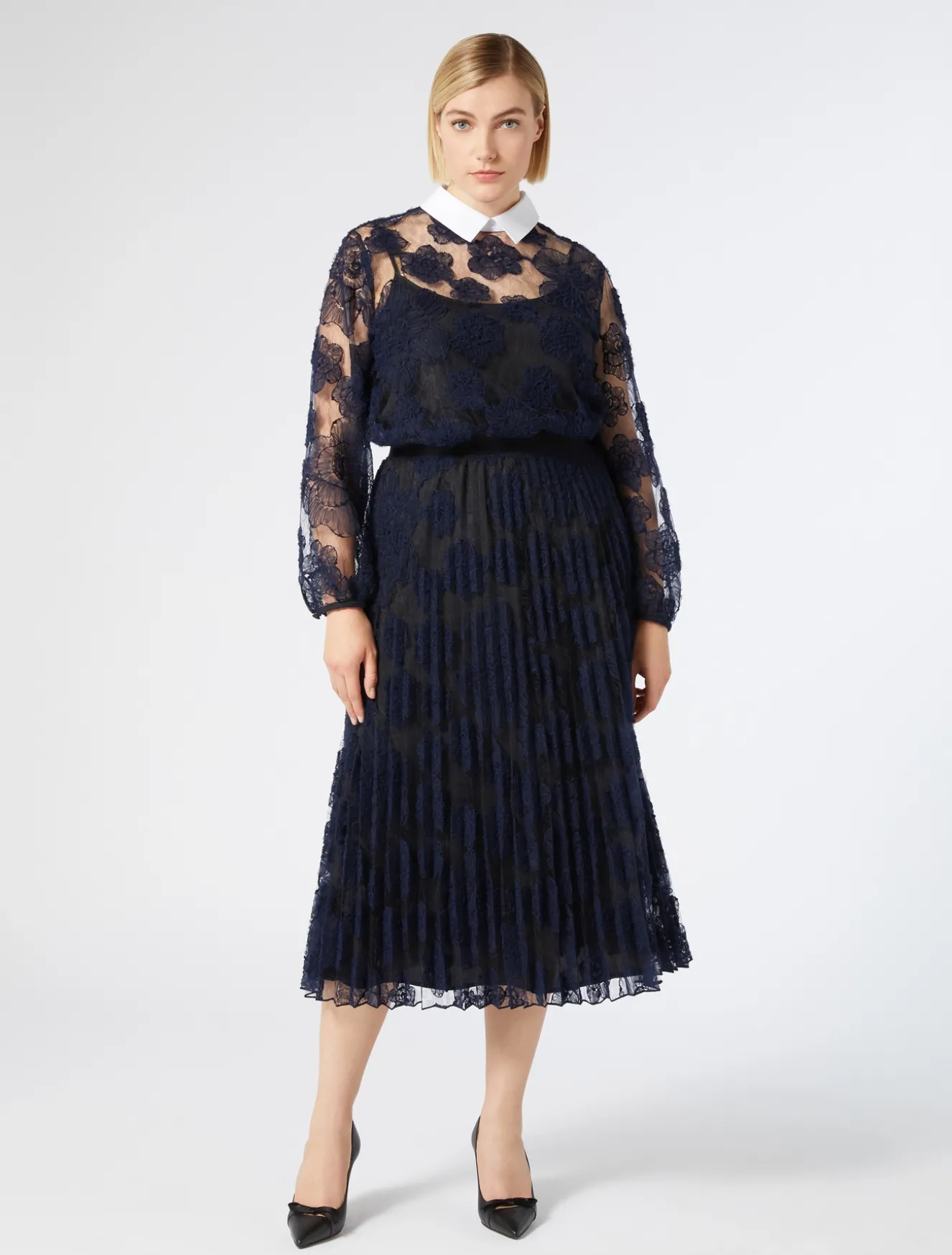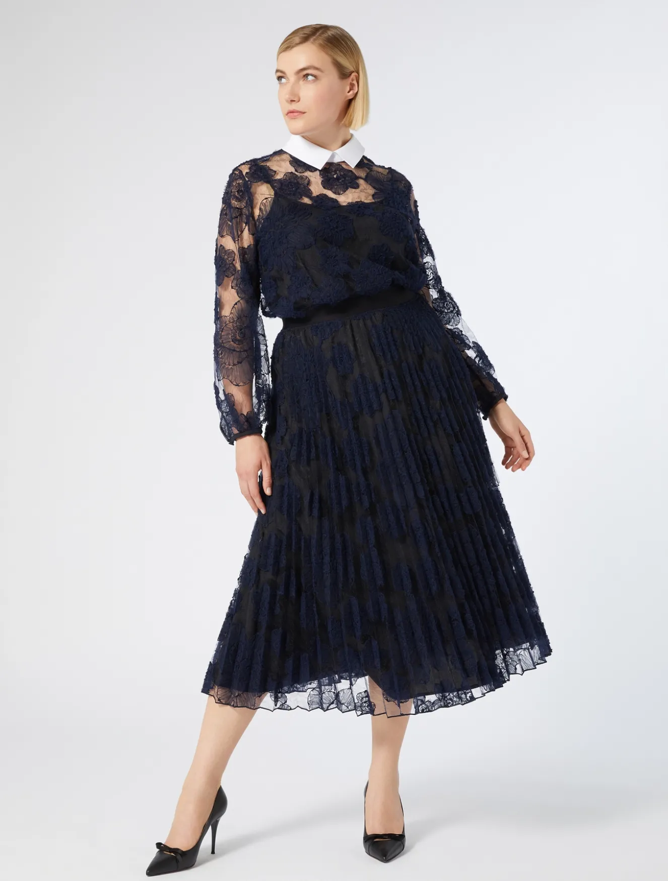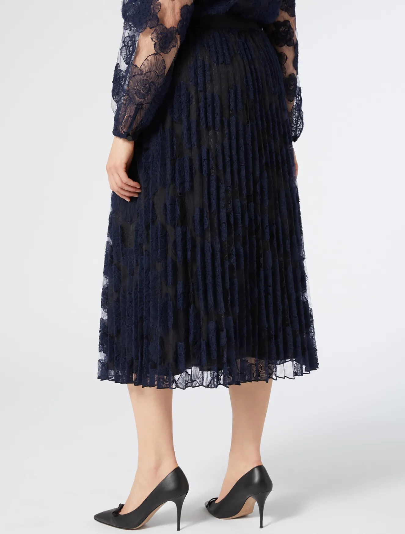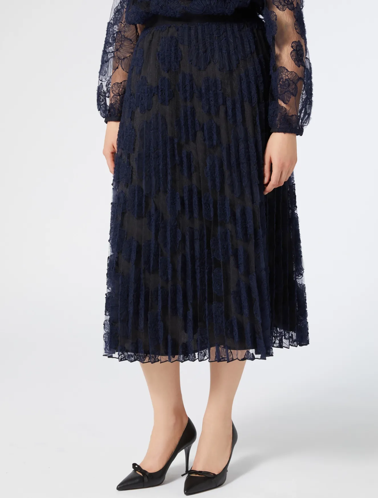 È lavorata a plissé soleil la gonna in pizzo ricamato a effetto tridimensionale. Raffinata e romantica, perfetta nelle occasioni speciali.