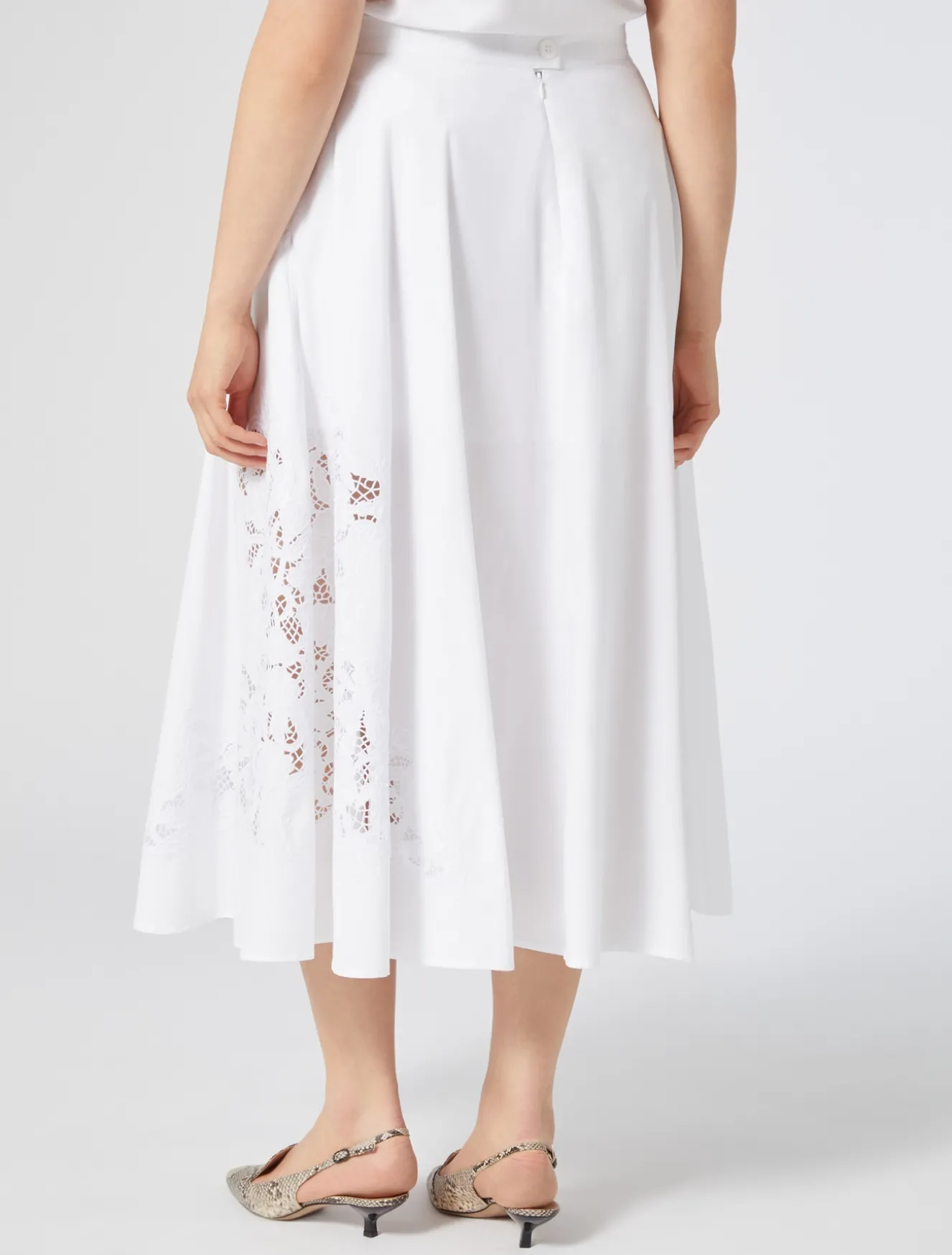 Fresca e femminile la gonna in popeline di puro cotone, impreziosita da un ricamo a intaglio in filo sul fianco. Ideale per elevare lo stile daily.