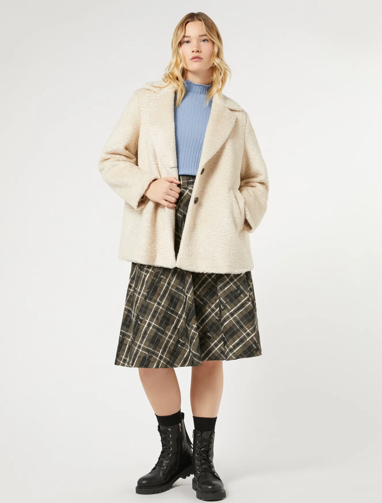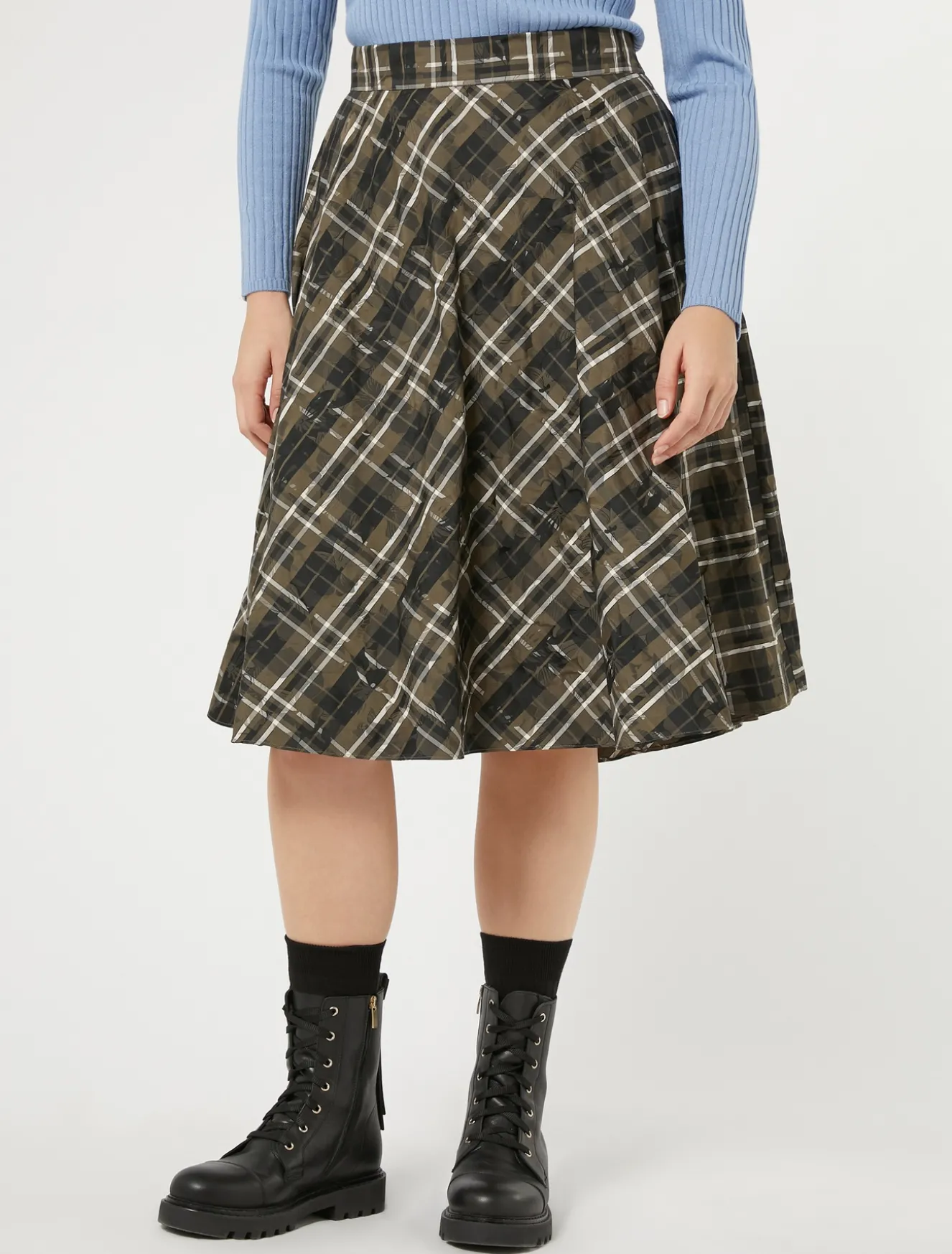 Silhouette femminili e texture raffinate per la gonna in taffetà jacquard tinto filo a disegno check floreale. Linea a ruota che rende il fit leggero. Il capo fa parte della collezione Persona by Marina Rinaldi.