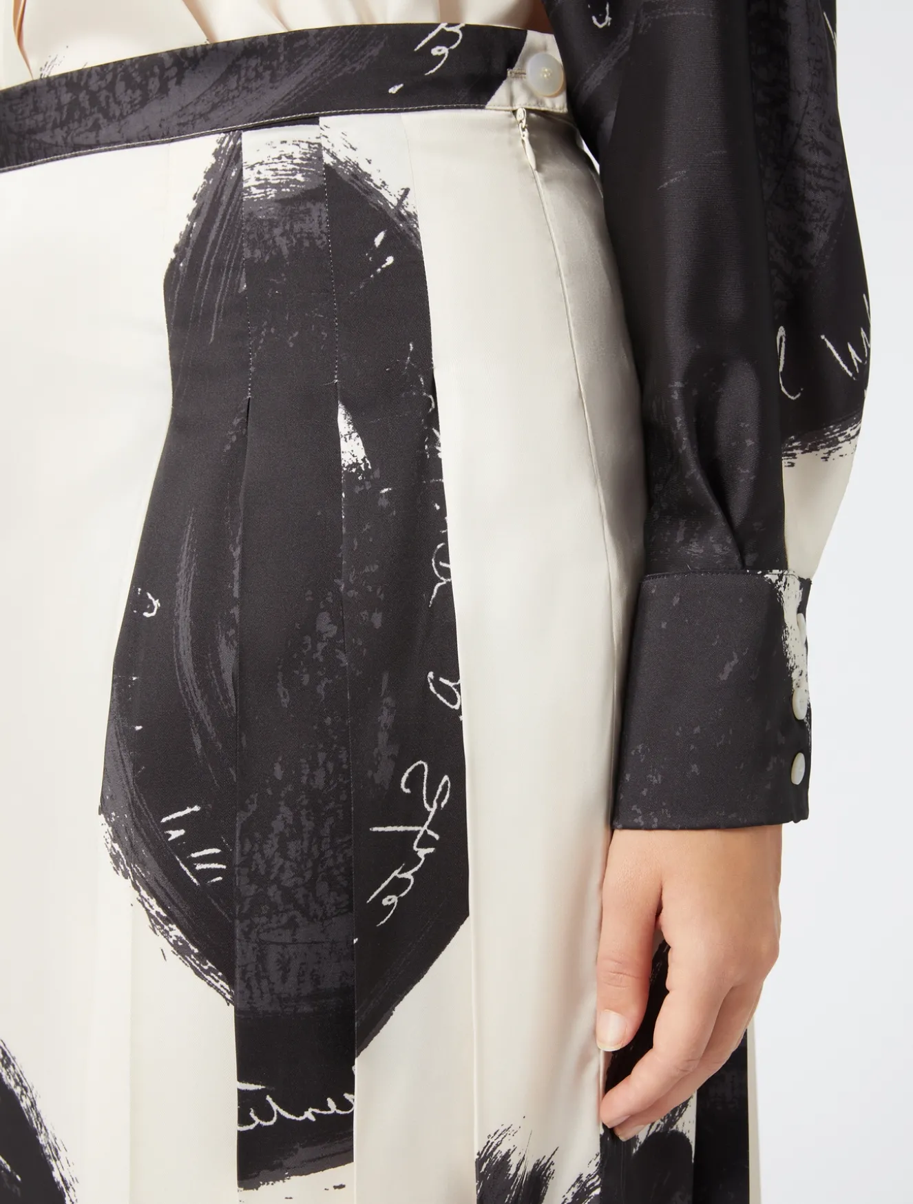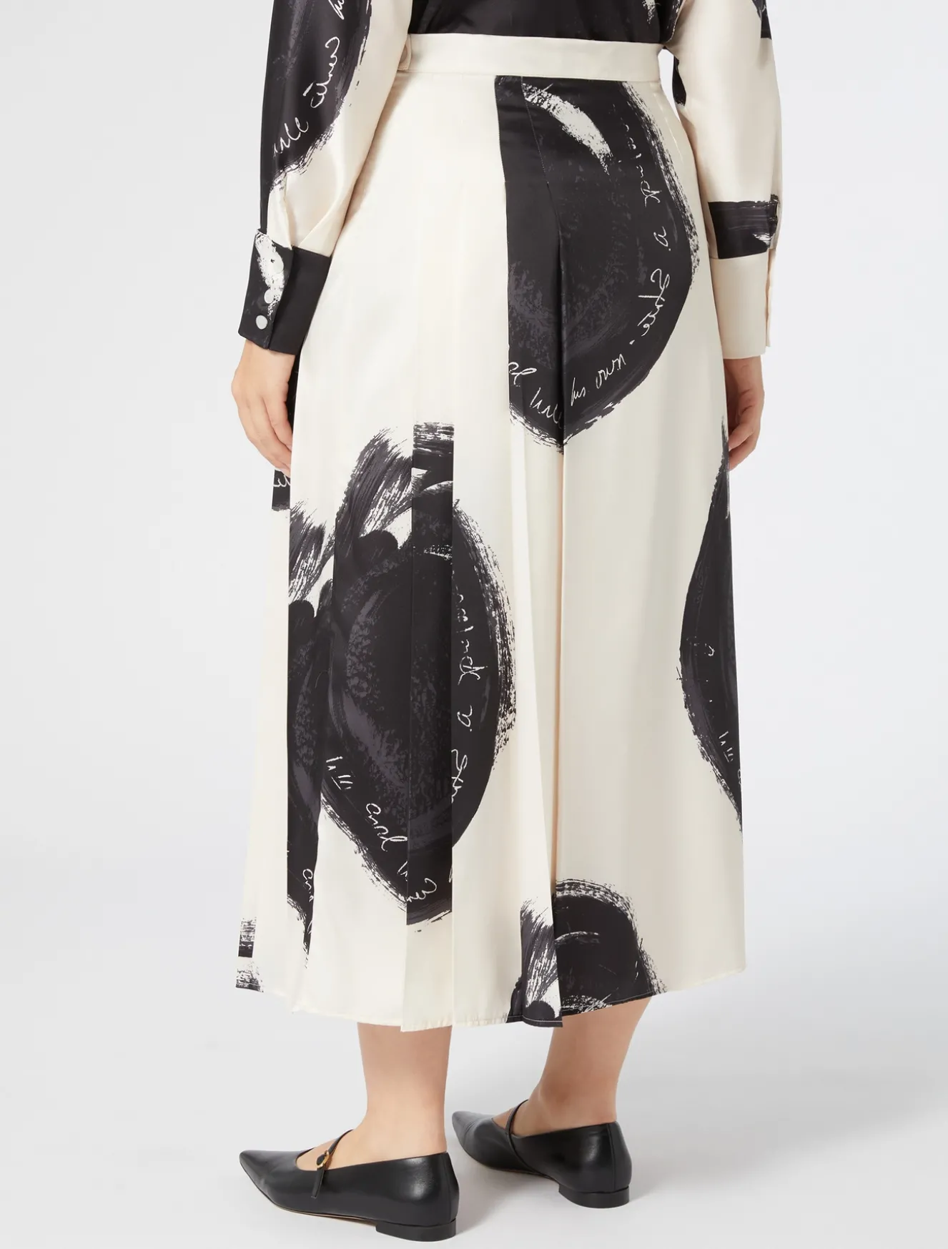 Pieghe asimmetriche per la gonna in twill di viscosa con stampa piazzata esclusiva a maxi pois. Design ricercato e attuale per completare lo stile dei look daily e speciali.Il capo fa parte della main collection Marina Rinaldi.