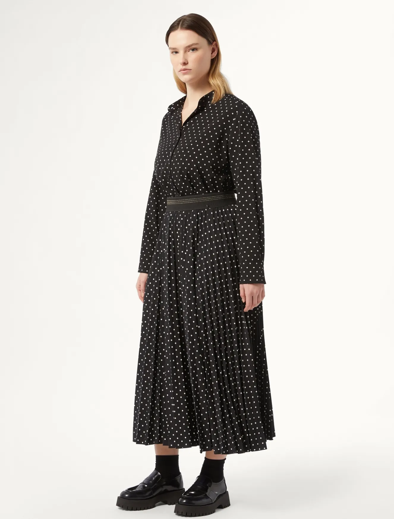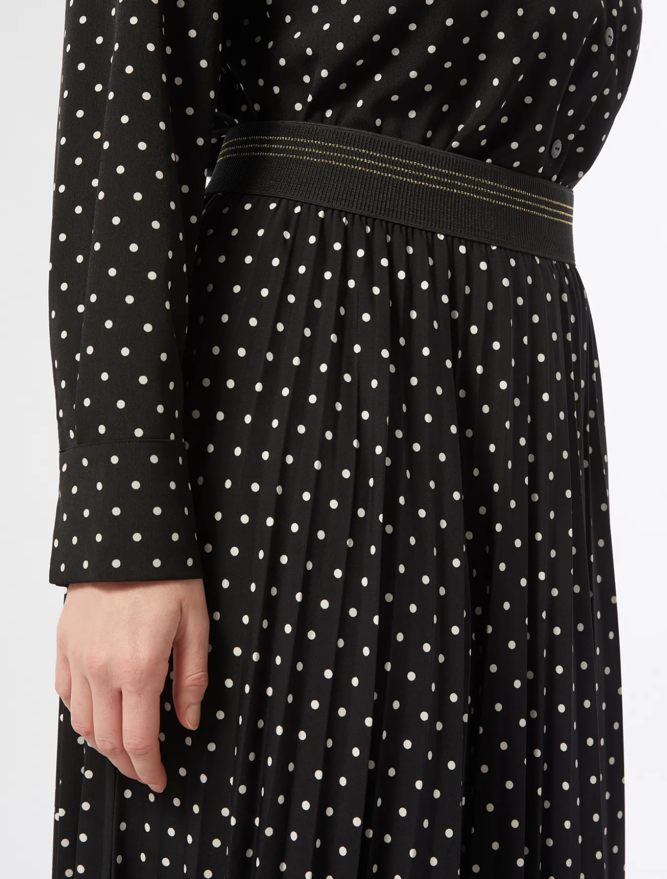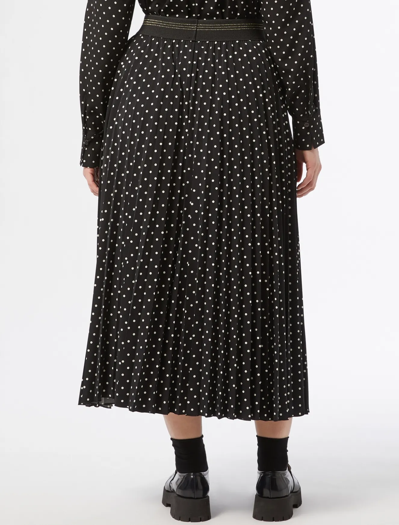 Attitudine femminile per la gonna lunga in jersey con lavorazione plissé e stampa a pois. Perfetta per dare movimento al tuo stile in un attimo.Il capo fa parte della collezione Marina Sport.