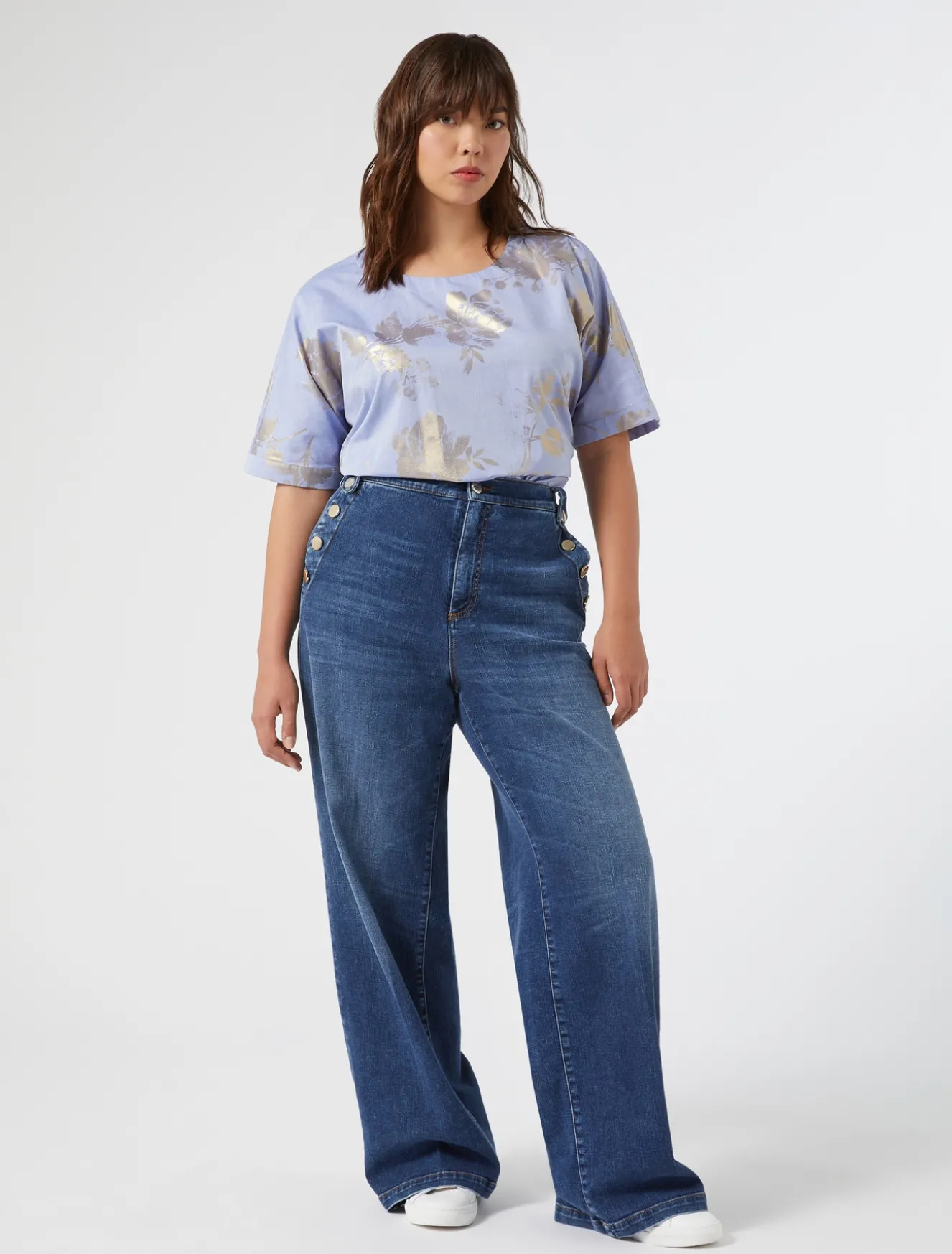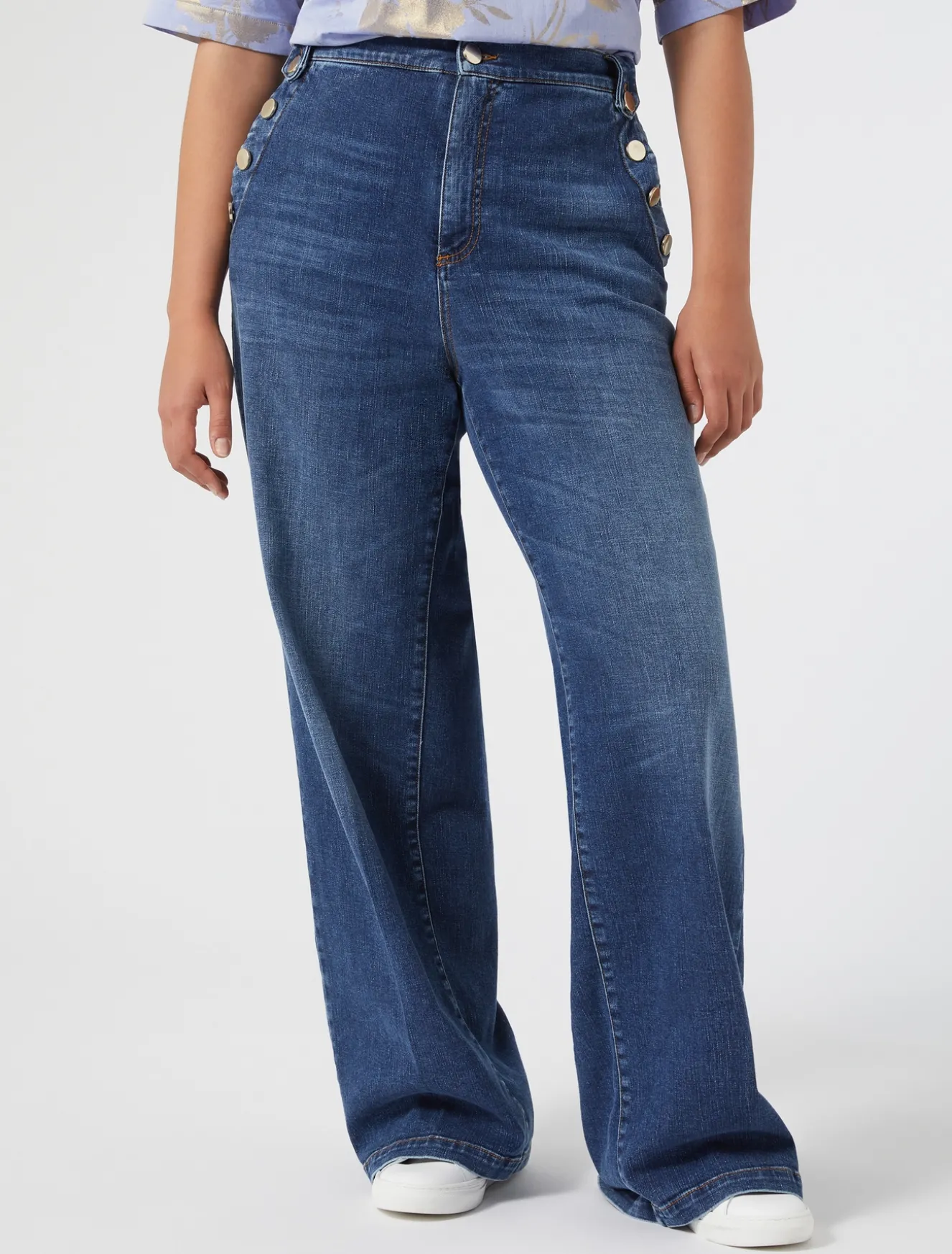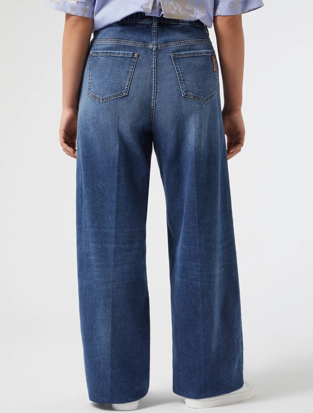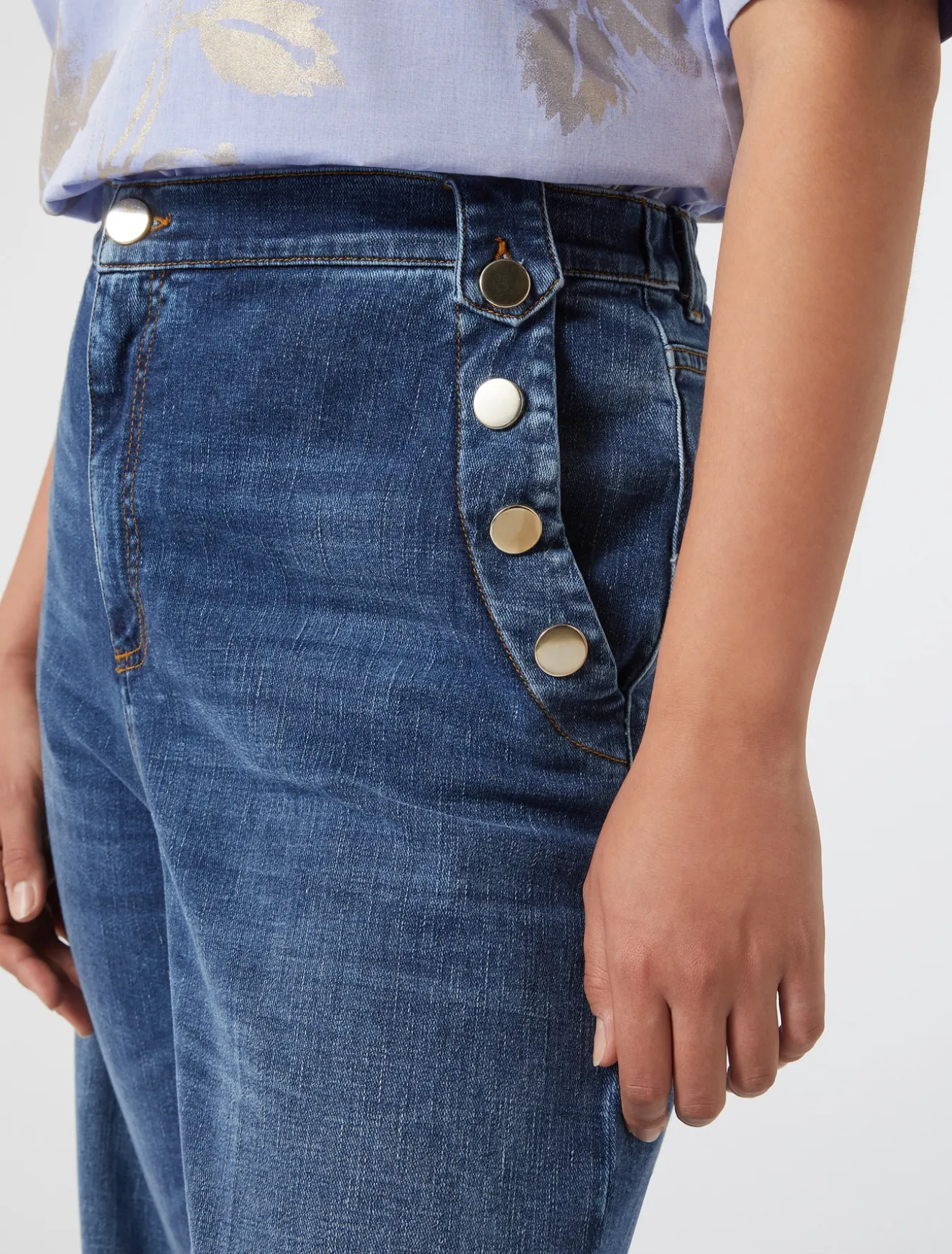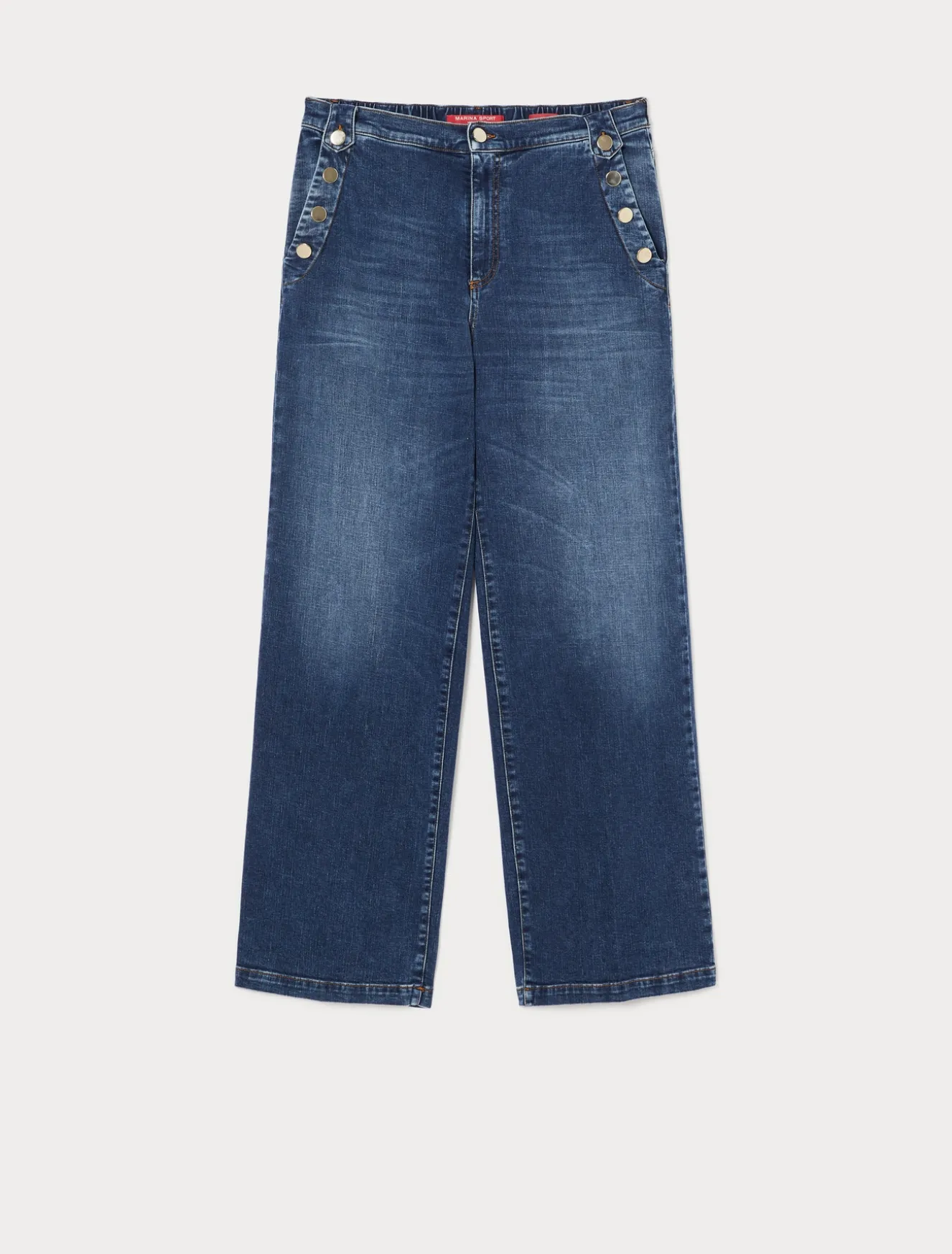 Design in stile marinière per i pantaloni in denim di cotone monoelastico in trama, trattato in capo. Un modello che diventa protagonista dello stile.
