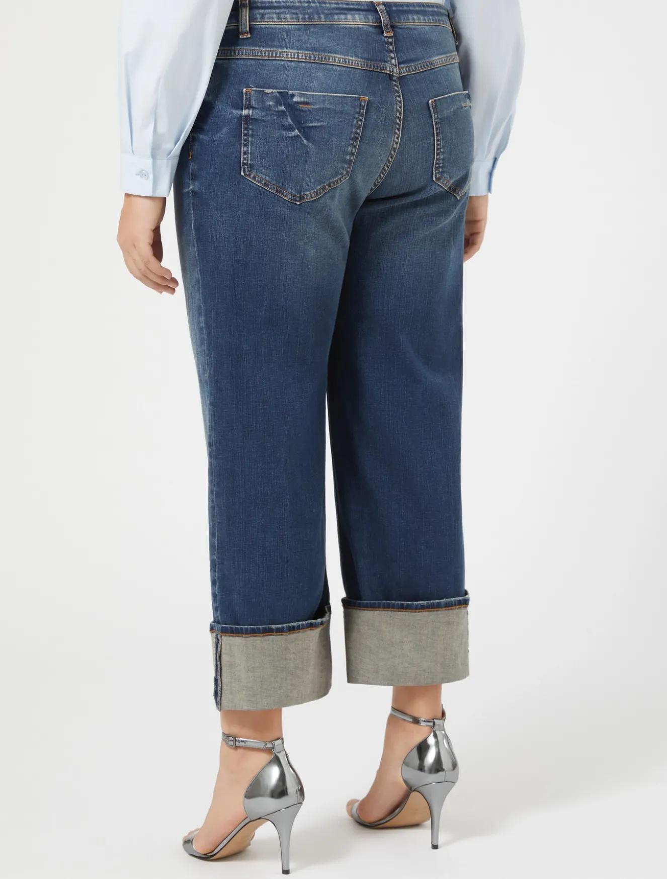 Dettagli di stile per i pantaloni in denim di cotone con design cinque tasche. Lavaggio stone wash. La piega stirata al centro e il maxi risvolto a fondo gamba donano un tocco contemporaneo.Il capo fa parte della collezione Persona by Marina Rinaldi.