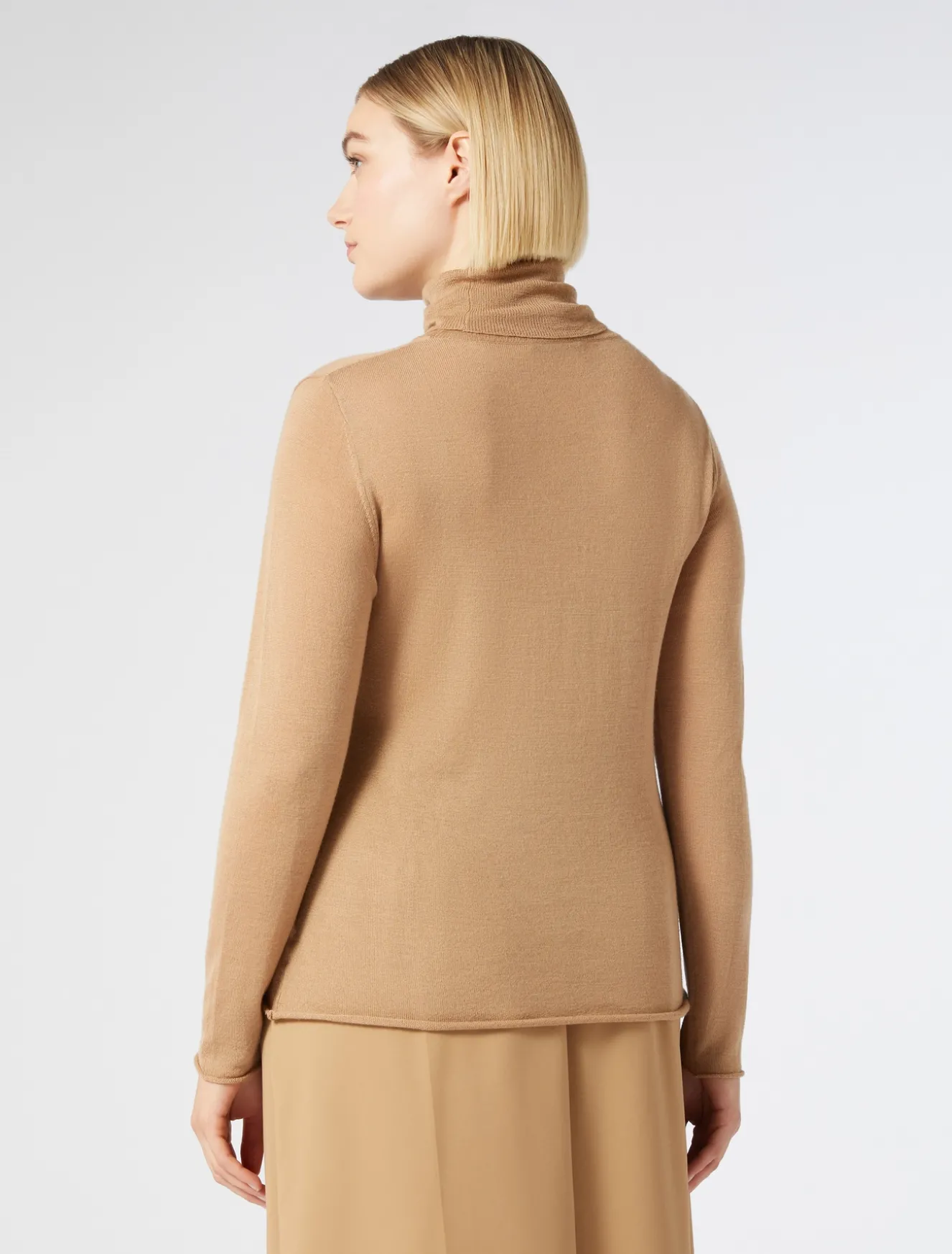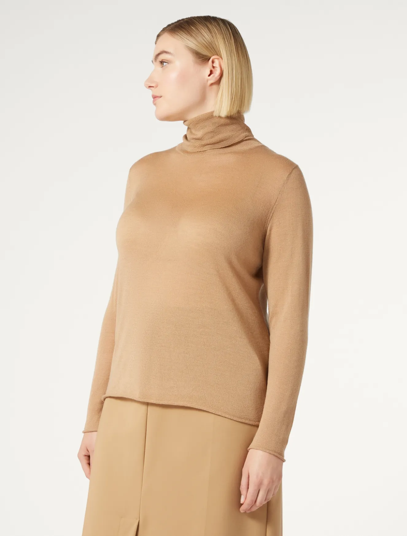 Lavorazione a garza effetto lingerie per la maglia dolcevita in lana, seta e cachemire. Impalpabile e chic per completare lo stile con un tocco raffinato.Il capo fa parte della main collection Marina Rinaldi.