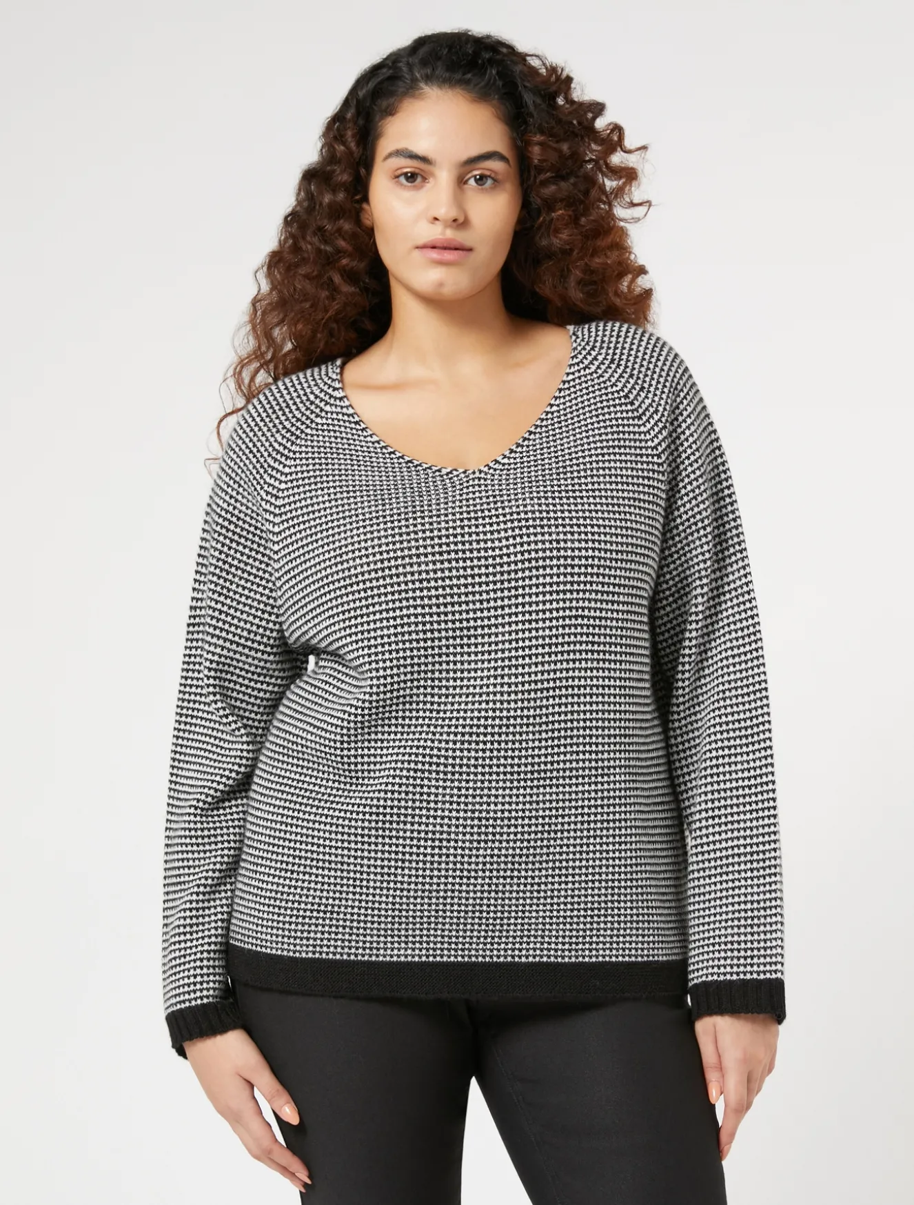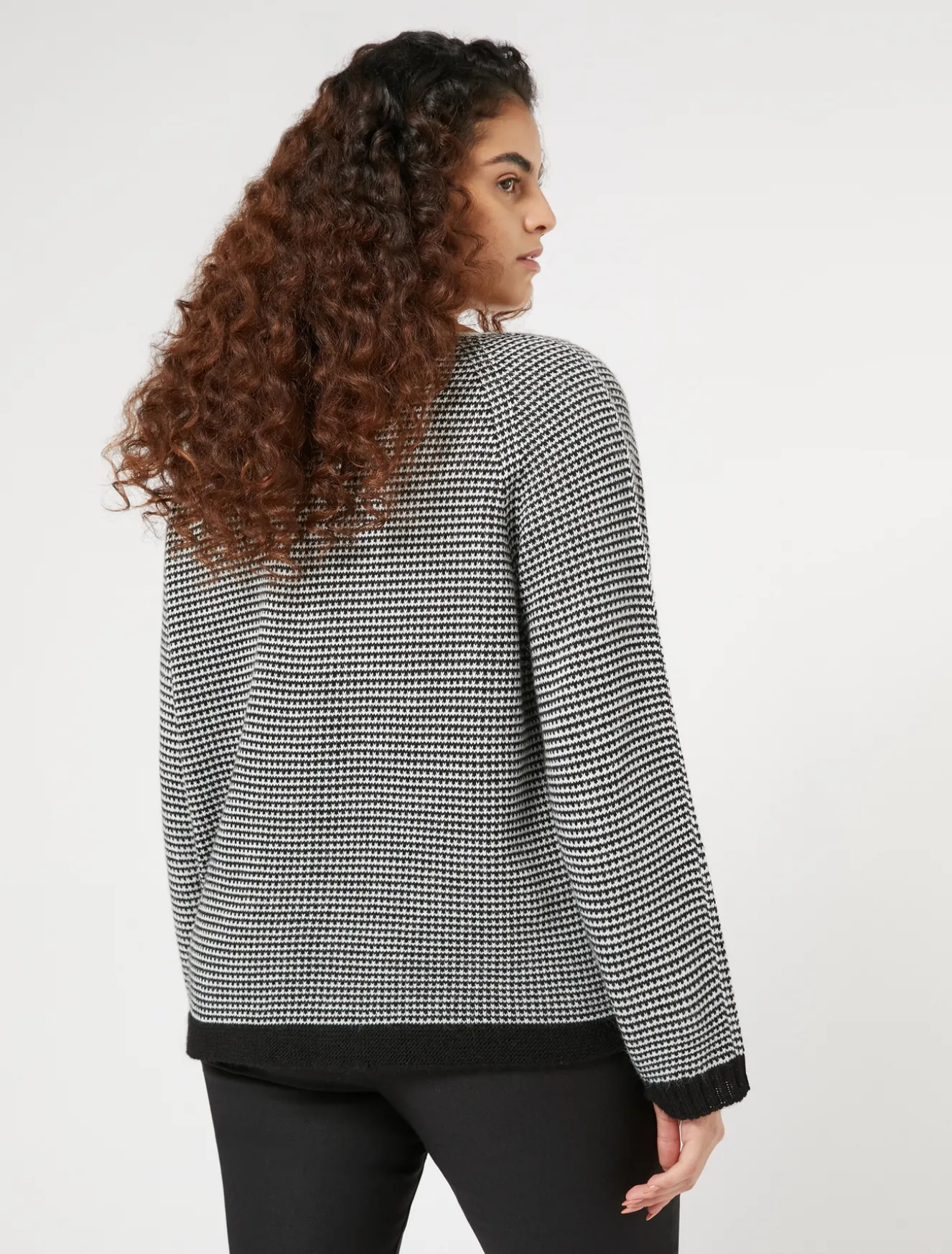 Linee essenziali per la maglia in filato di misto lana e viscosa con scollo a V e maniche raglan lunghe. La lavorazione con effetto bi-color caratterizza il capo.Il capo fa parte della collezione N.O.W.