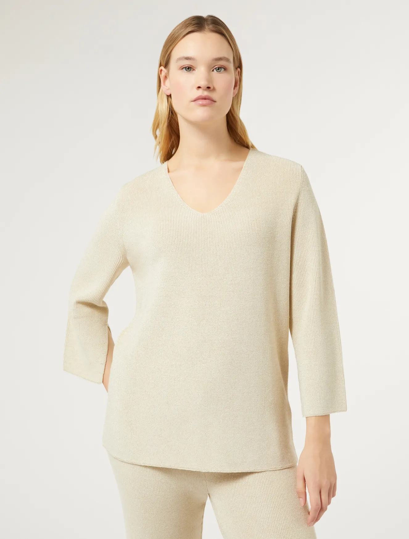 Lavorazione in punto pannocchia per la maglia in lana e lurex. Eleganza da indossare tutti i giorni.Il capo fa parte della collezione Voyage.