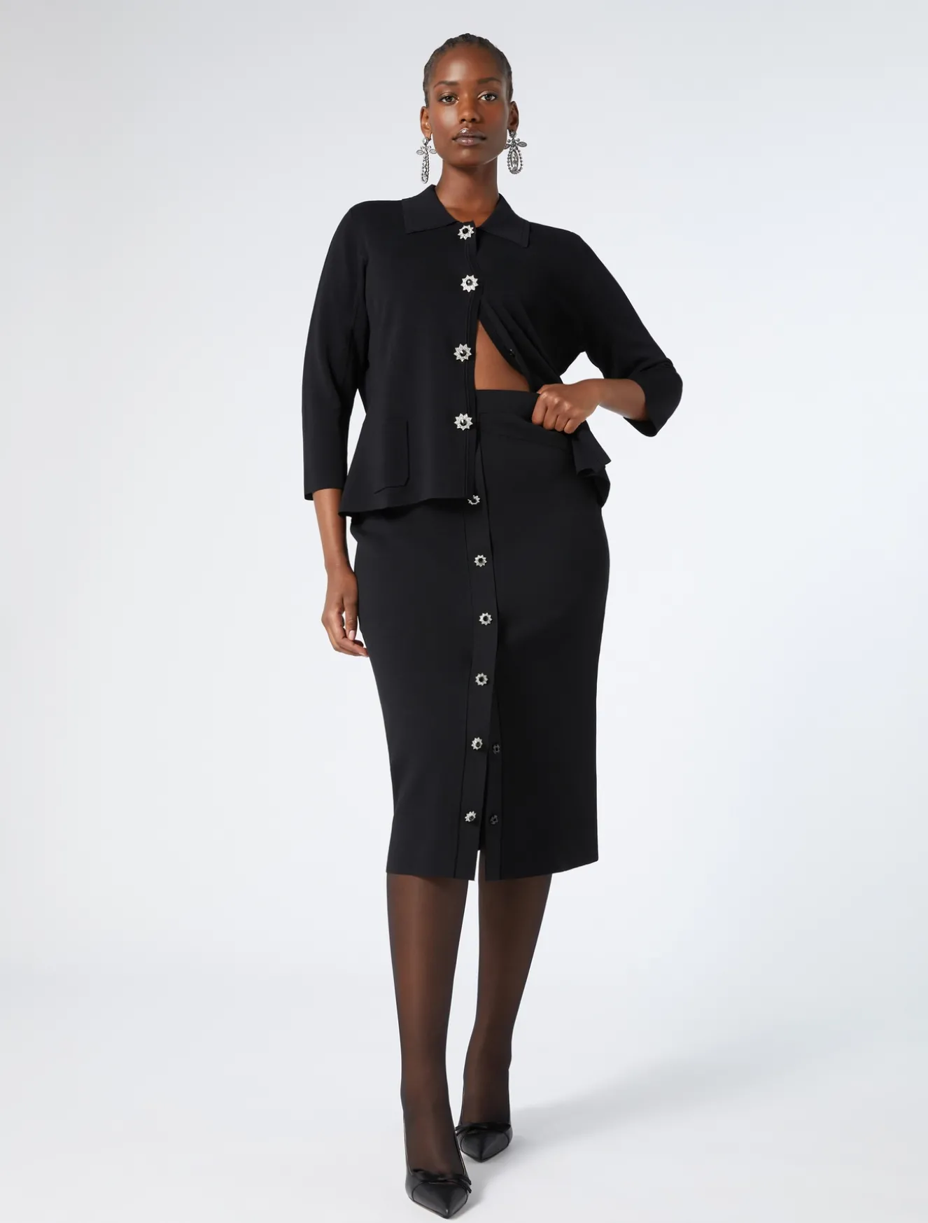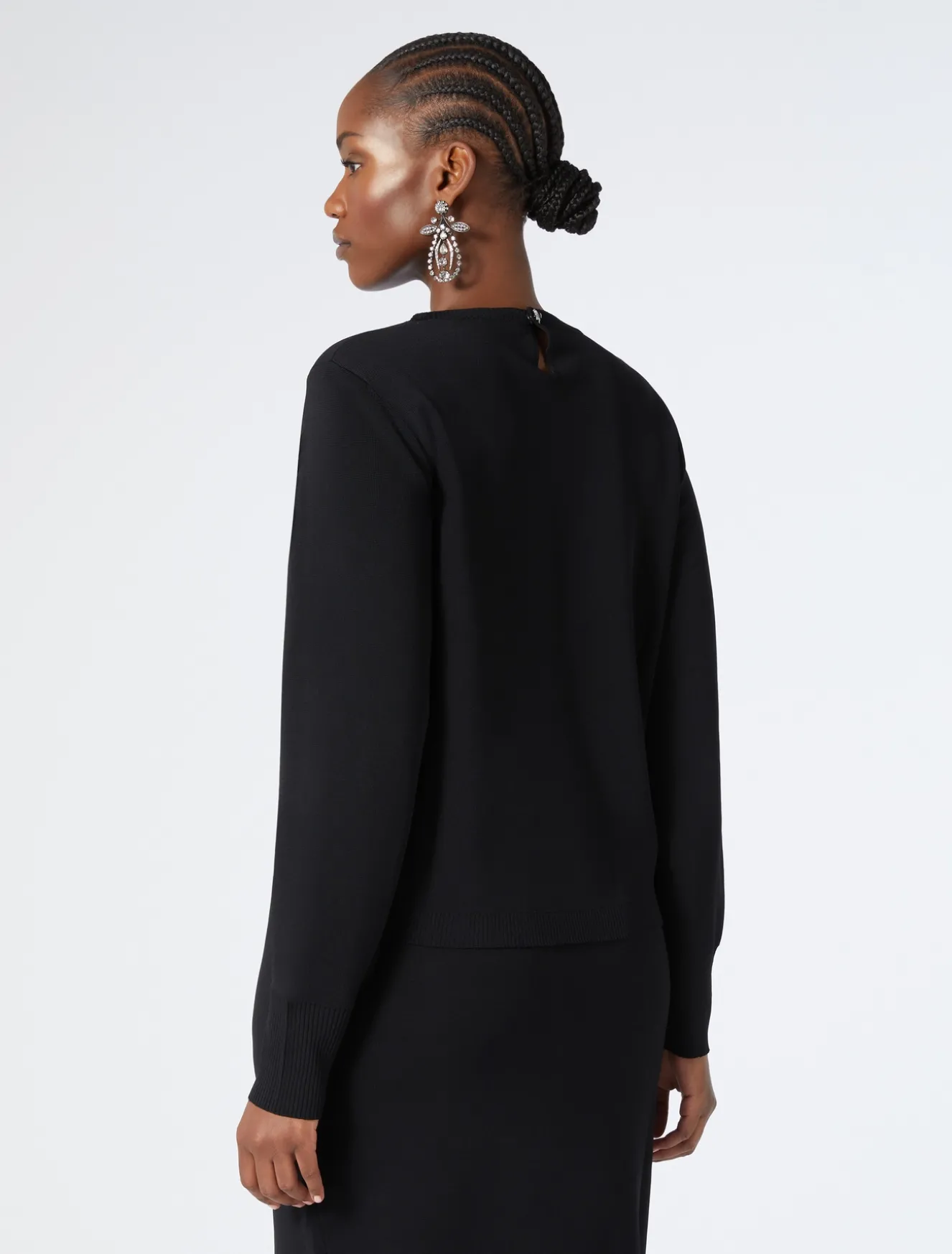 Completa il tuo stile con la maglia in viscosa opaca comfort con bottone gioiello sul retro. Knitwear versatile da avere in guardaroba, anche in abbinamento alla gonna in coordinato.