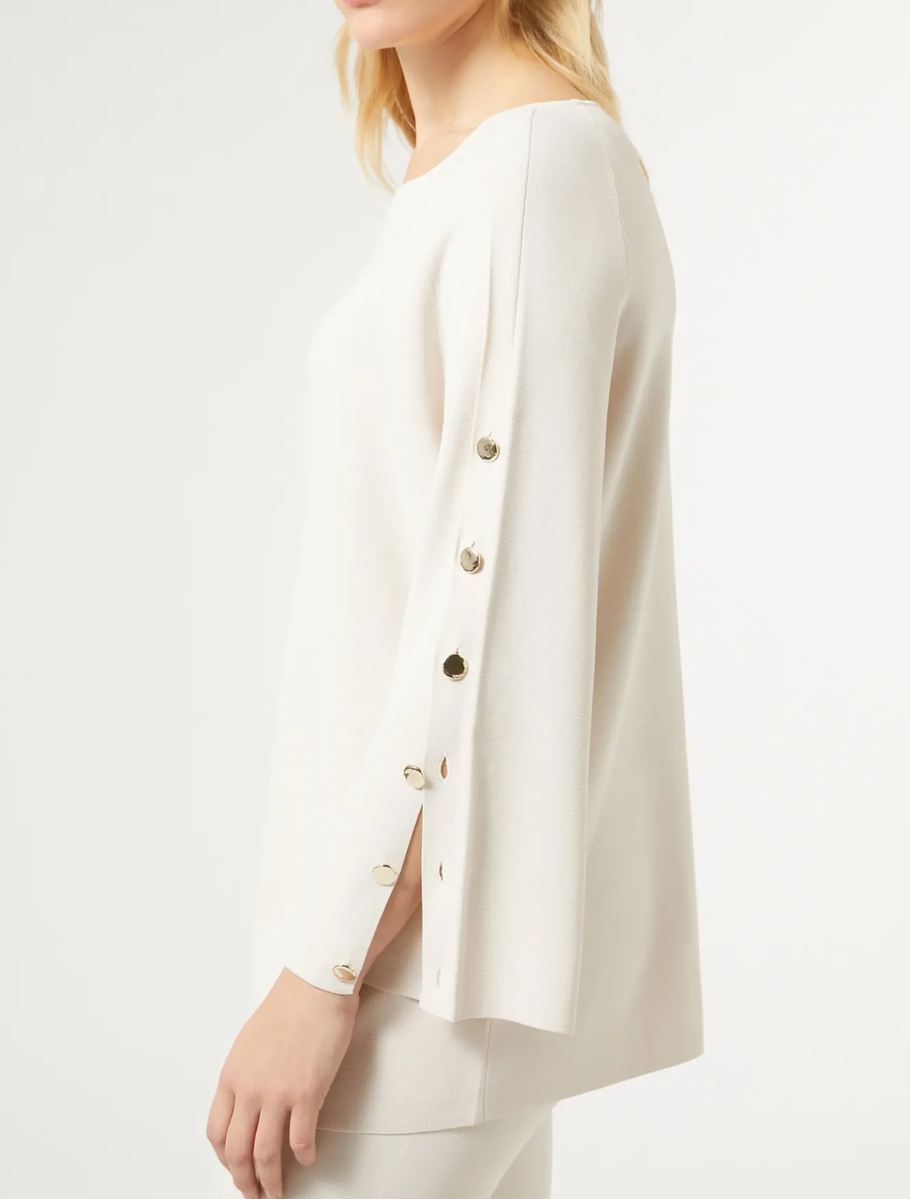 Design ricercato per la maglia di viscosa opaca comfort lavorazione punto stoffa calato con aperture sulle maniche e bottoni gioiello. Eleverà in un attimo lo stile.Il capo fa parte della main collection Marina Rinaldi.