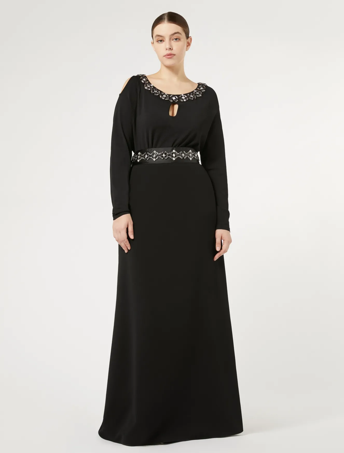 Dettagli preziosi e fit semiaderente definiscono lo stile della maglia in filato di viscosa crêpe stretch. È impreziosita da una passamaneria di ricami a castoni jais e crystal. Il capo fa parte della collezione Elegante.