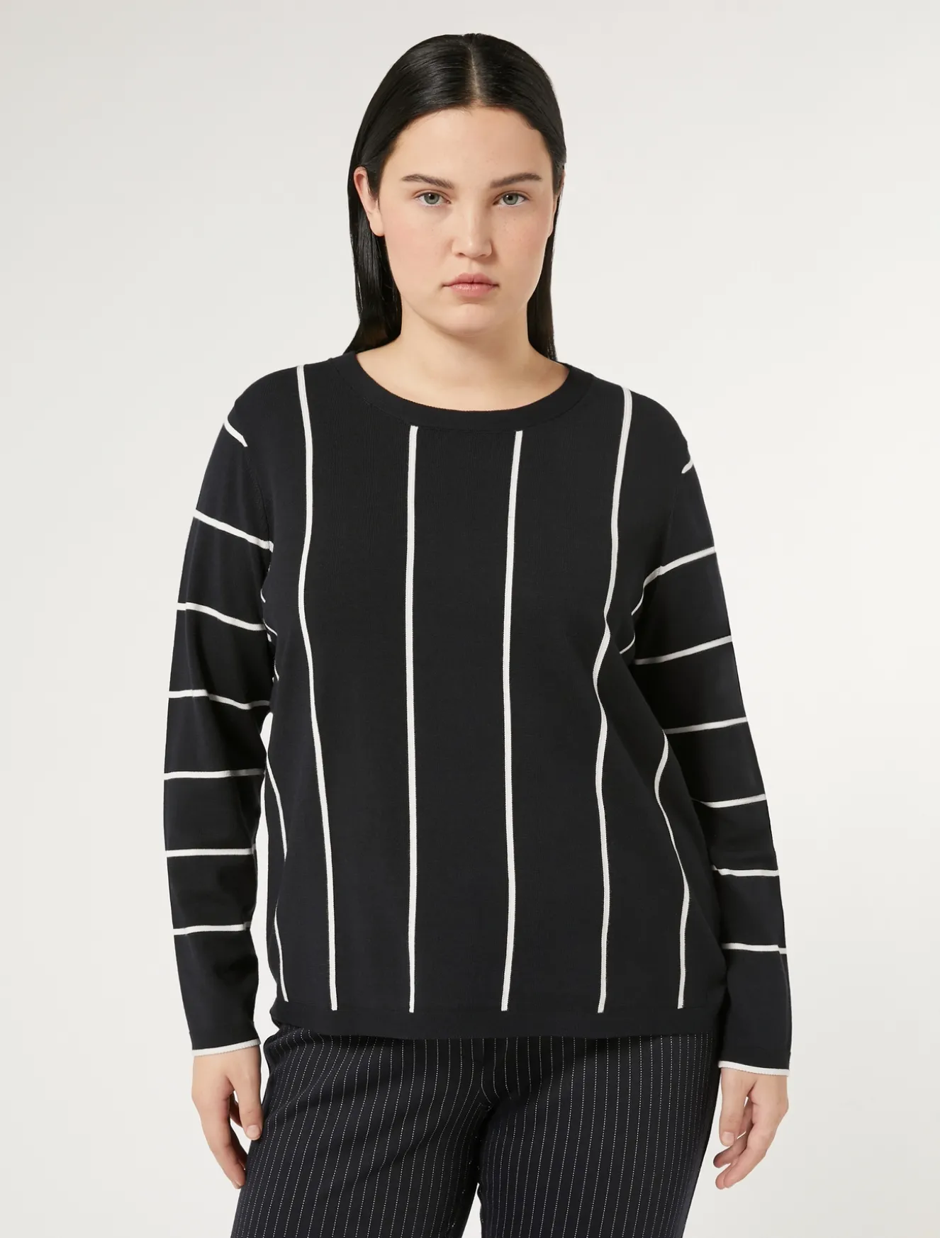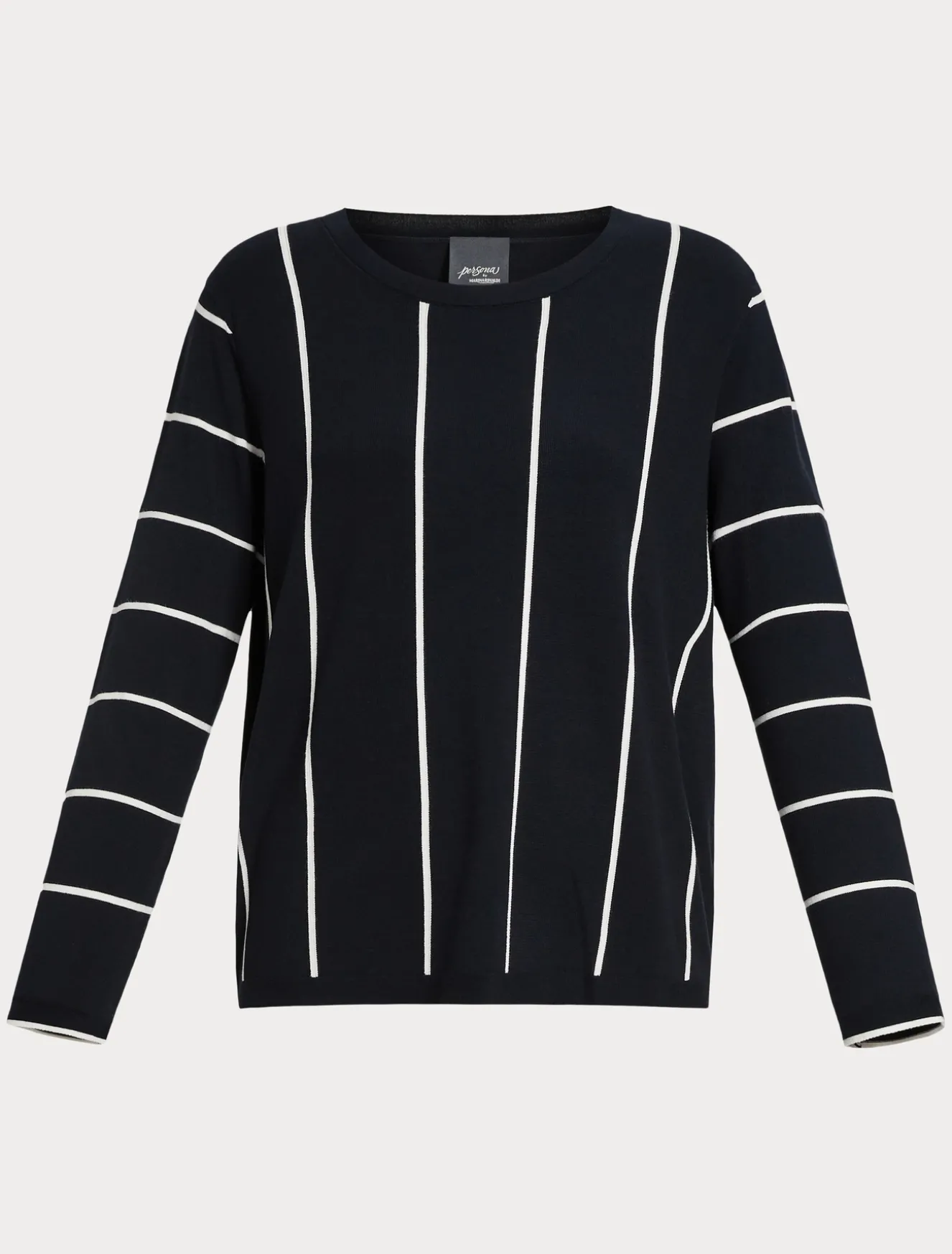 Texture definite per la maglia con girocollo e maniche lunghe rifinita dai motivi a intarsio. I giochi geometrici in bi-color moltiplicano le possibilità di abbinamento.Il capo fa parte della collezione Persona by Marina Rinaldi.