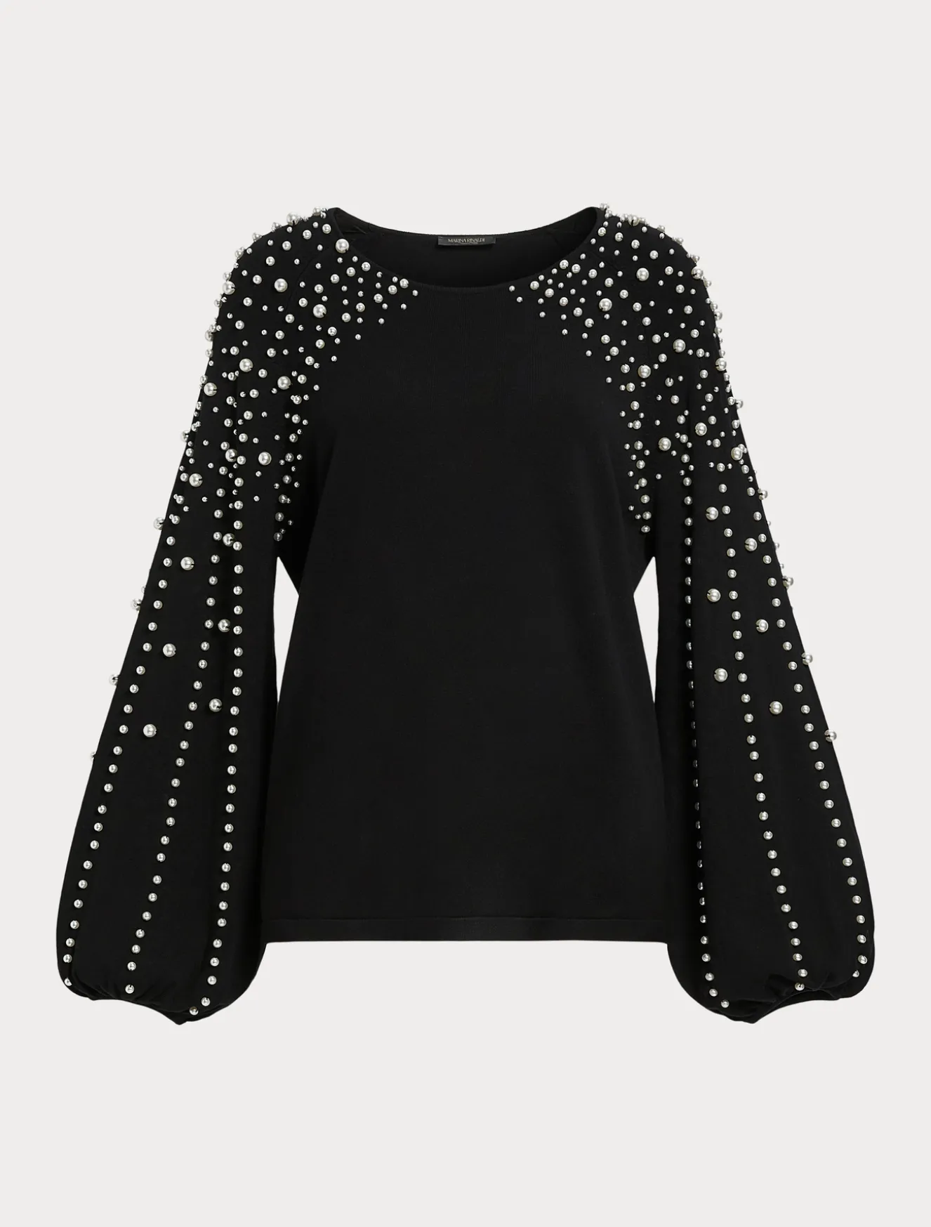 È impreziosita da un ricamo di perle cucite a mano la maglia in filato di viscosa stretch mano calda. Un knitwear bijoux per completare i tuoi look specialiIl capo fa parte della collezione Elegante.