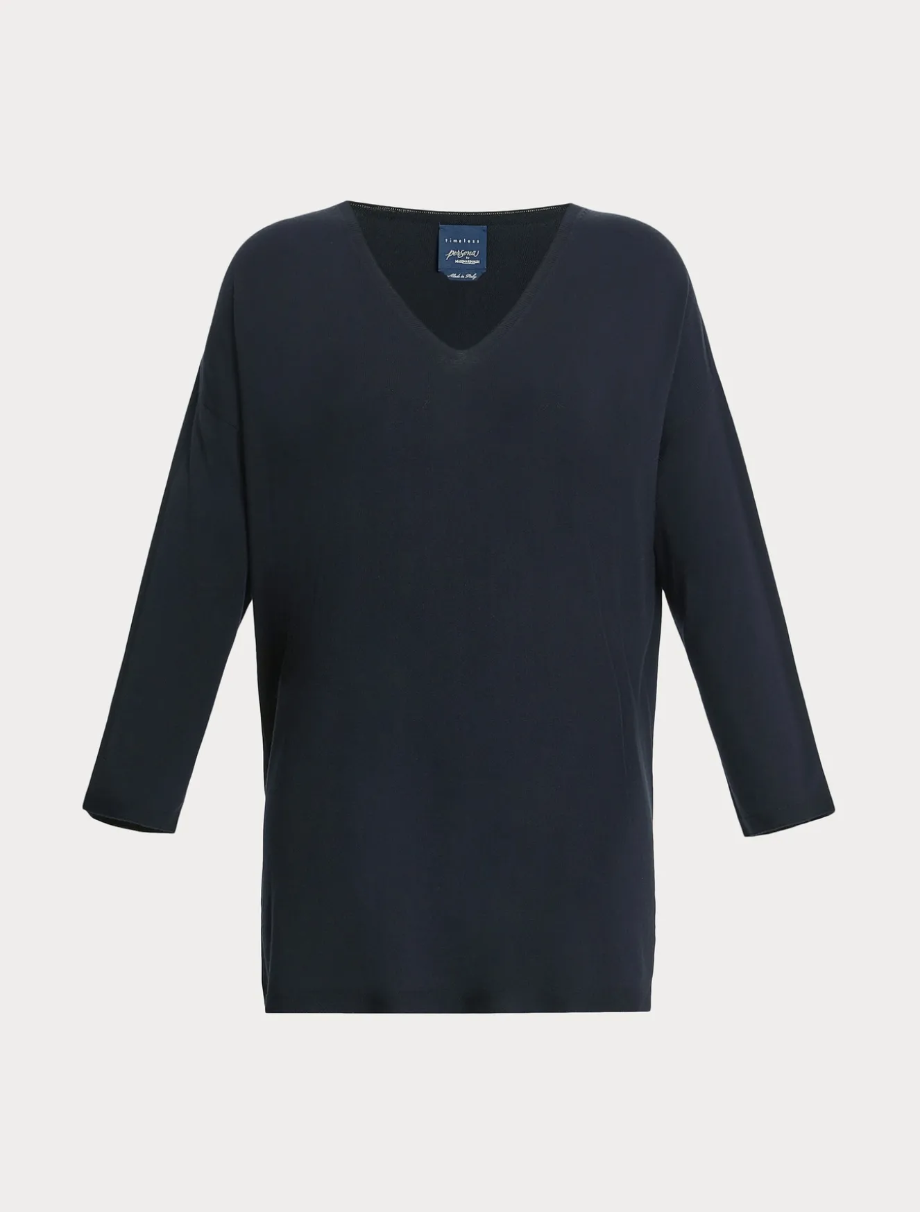 Linee essenziali per la maglia in viscosa stretch crêpe con scollo a V e maniche a tre quarti. La lavorazione a punto rasato dona carattere alla texture del capo.Il capo fa parte della collezione Persona by Marina Rinaldi.