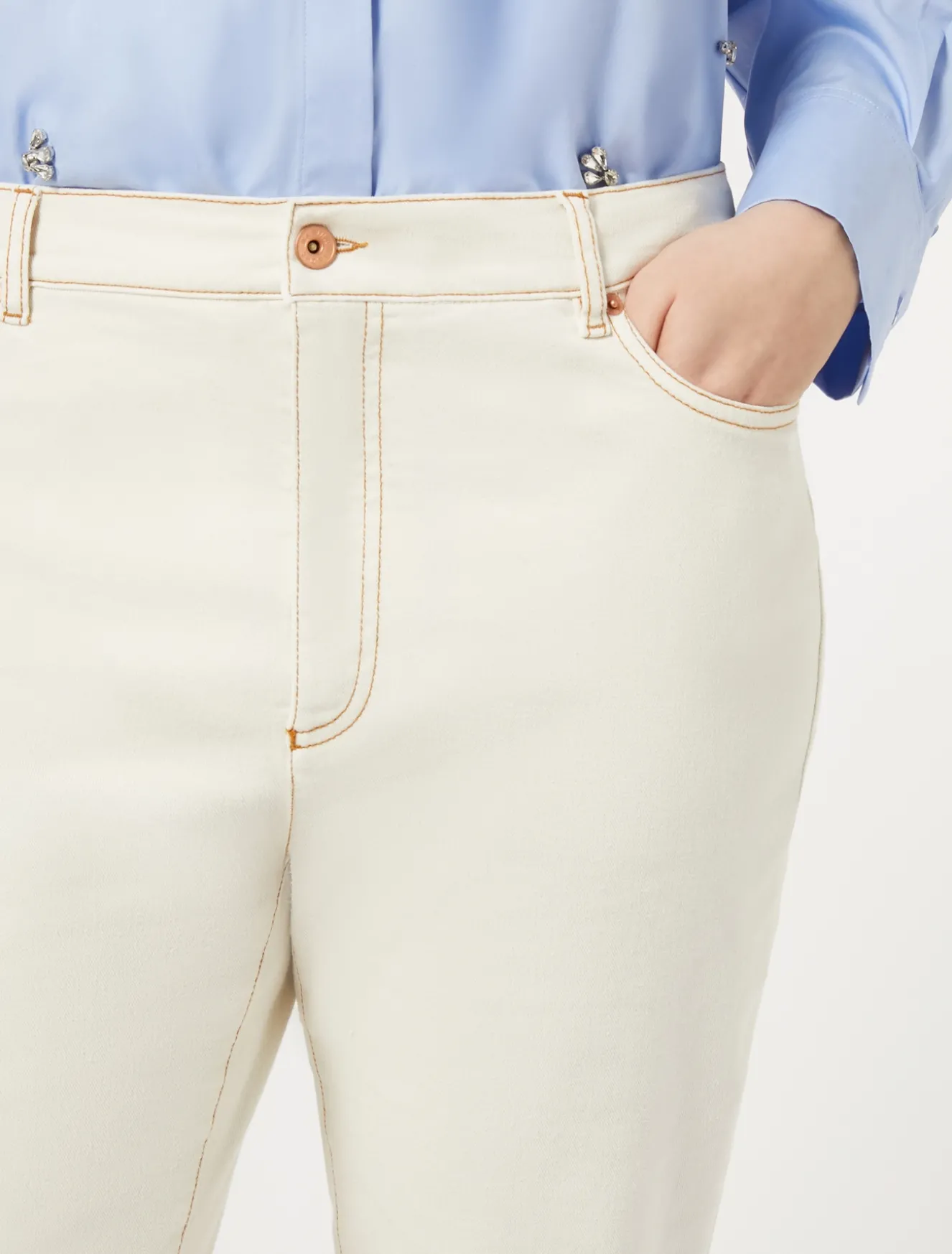 Fascino passe-partout per i pantaloni cinque tasche in bull di cotone monoelastico in trama tinto in capo. Impunture a due aghi in colore a contrasto. Da interpretare con facilità in una miriade di outfit, anche in abbinamento alla giacca in coordinato.Il capo fa parte della collezione Marina Sport.