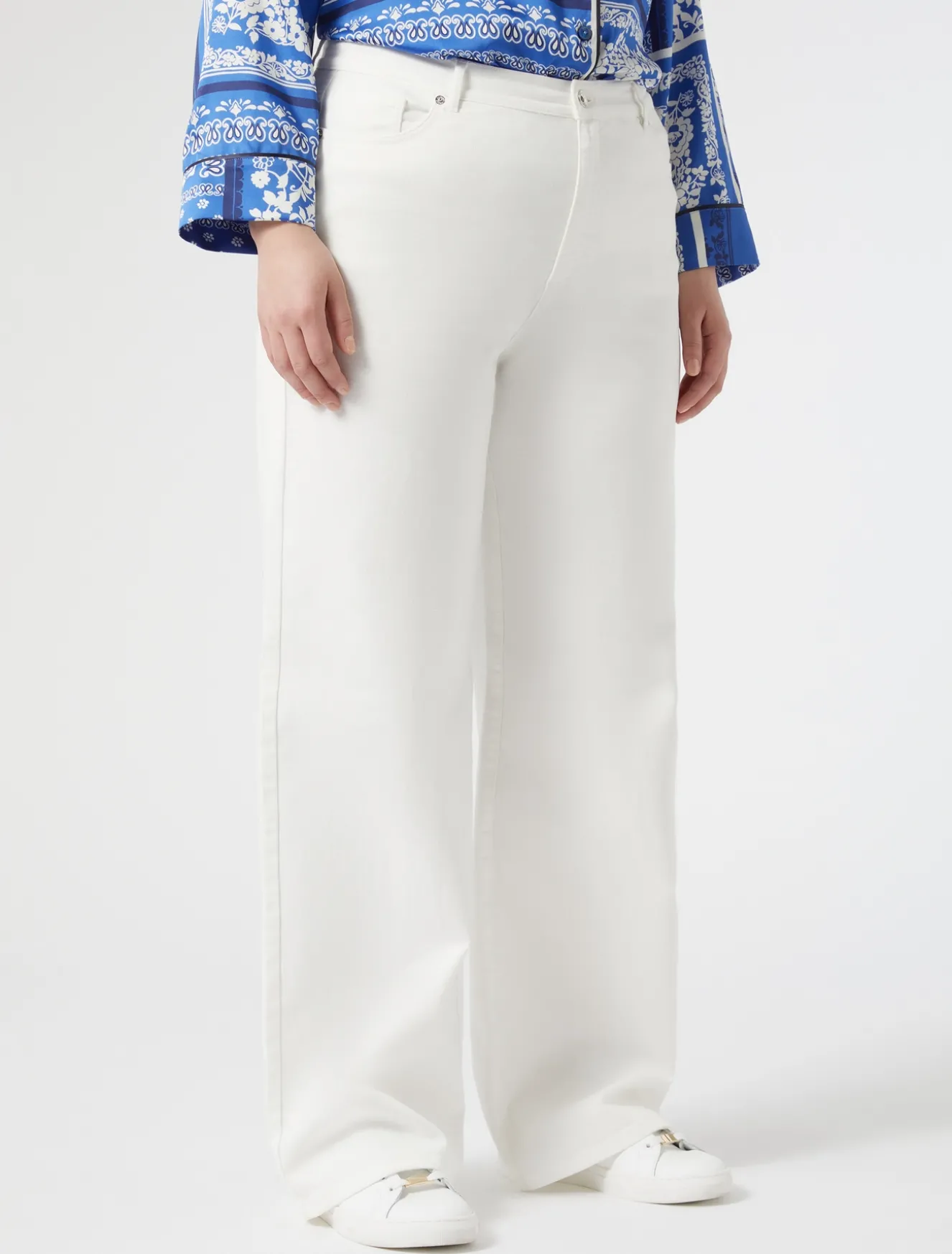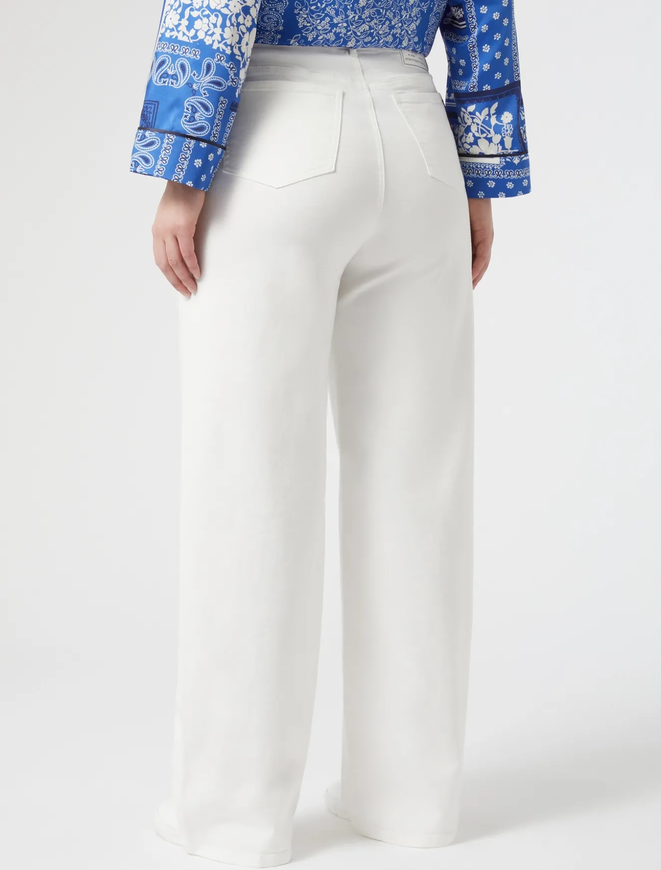 Indossa come vuoi i pantaloni in bull di cotone stretch tinto capo, dalla linea a palazzo. Base perfetta di una miriade di look off duty.