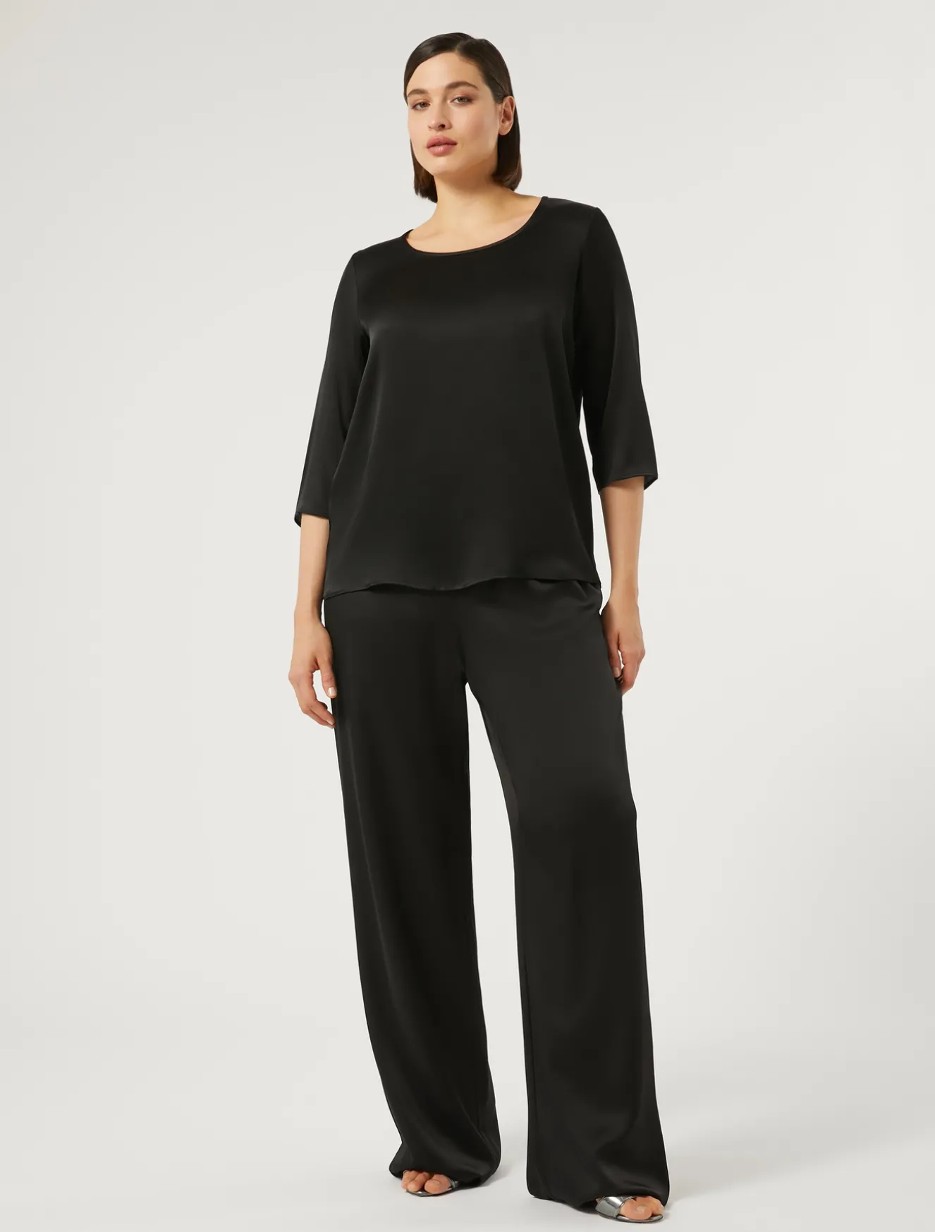 Eleganza passe-partout per i pantaloni in frisottino lucido, dalla linea ampia. Si indossano in un attimo grazie all’elastico in vita.
