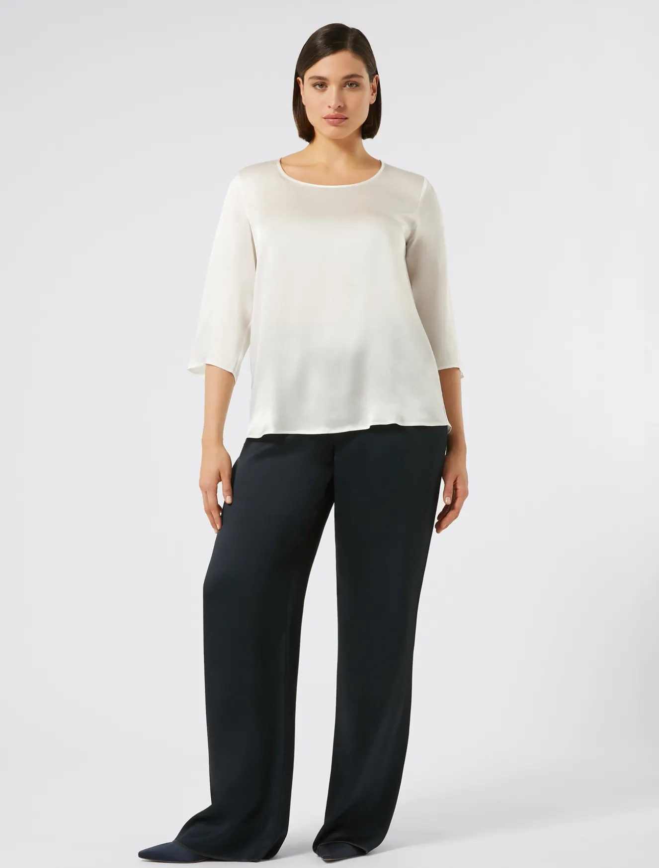 Eleganza passe-partout per i pantaloni in frisottino lucido, dalla linea ampia. Si indossano in un attimo grazie all’elastico in vita.