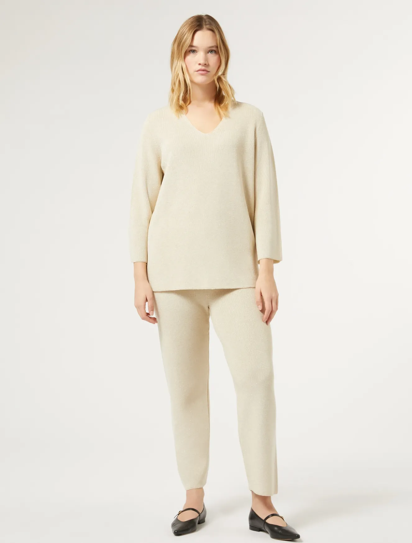 Lavorazione in punto pannocchia per i pantaloni in maglia, dalla linea dritta. Li puoi indossare in abbinamento alla maglia in coordinato. Il capo fa parte della collezione Voyage.