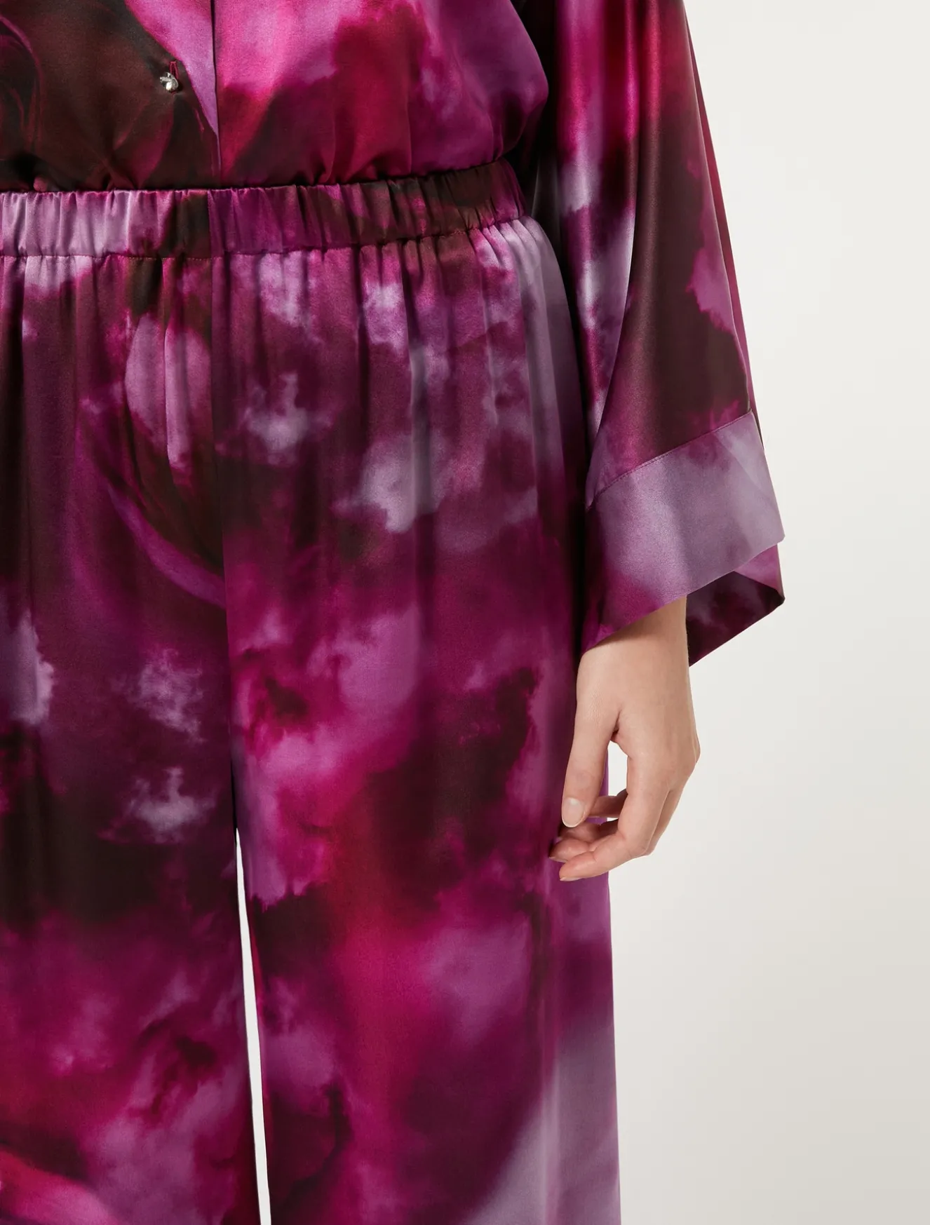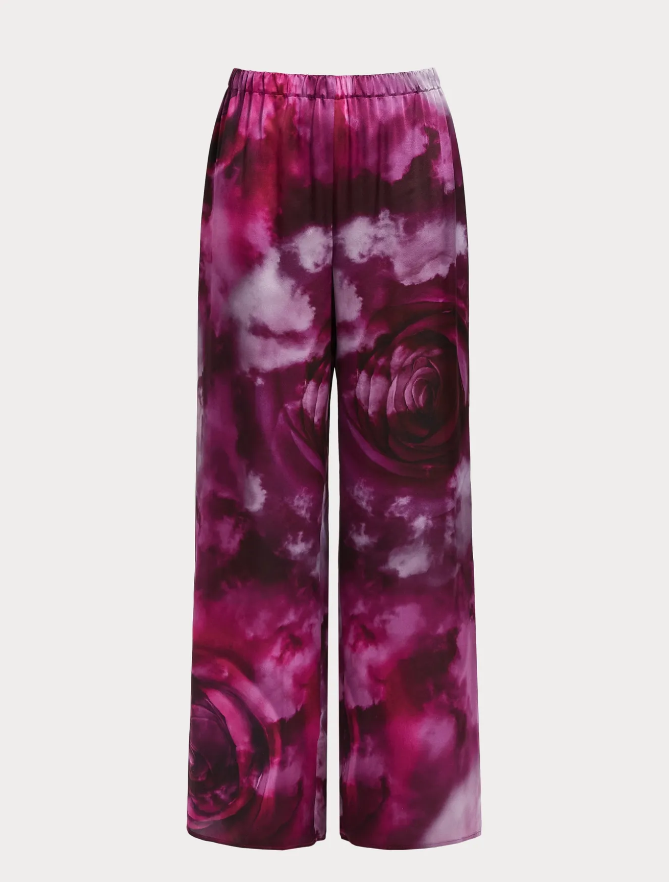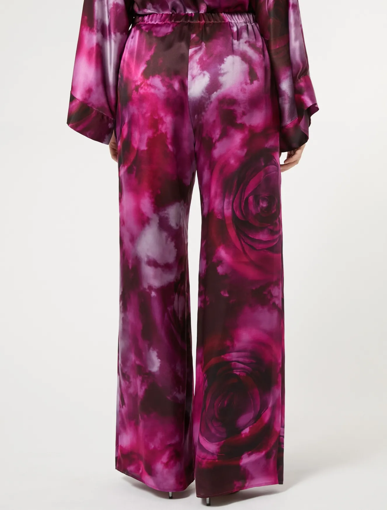 Stampa esclusiva con disegno a rose sfumate per i pantaloni ampi in raso di pura seta. Facili da indossare, daranno una nota raffinata ai tuoi look d’occasione, anche in abbinamento alla camicia in coordinato.Il capo fa parte della collezione Elegante.