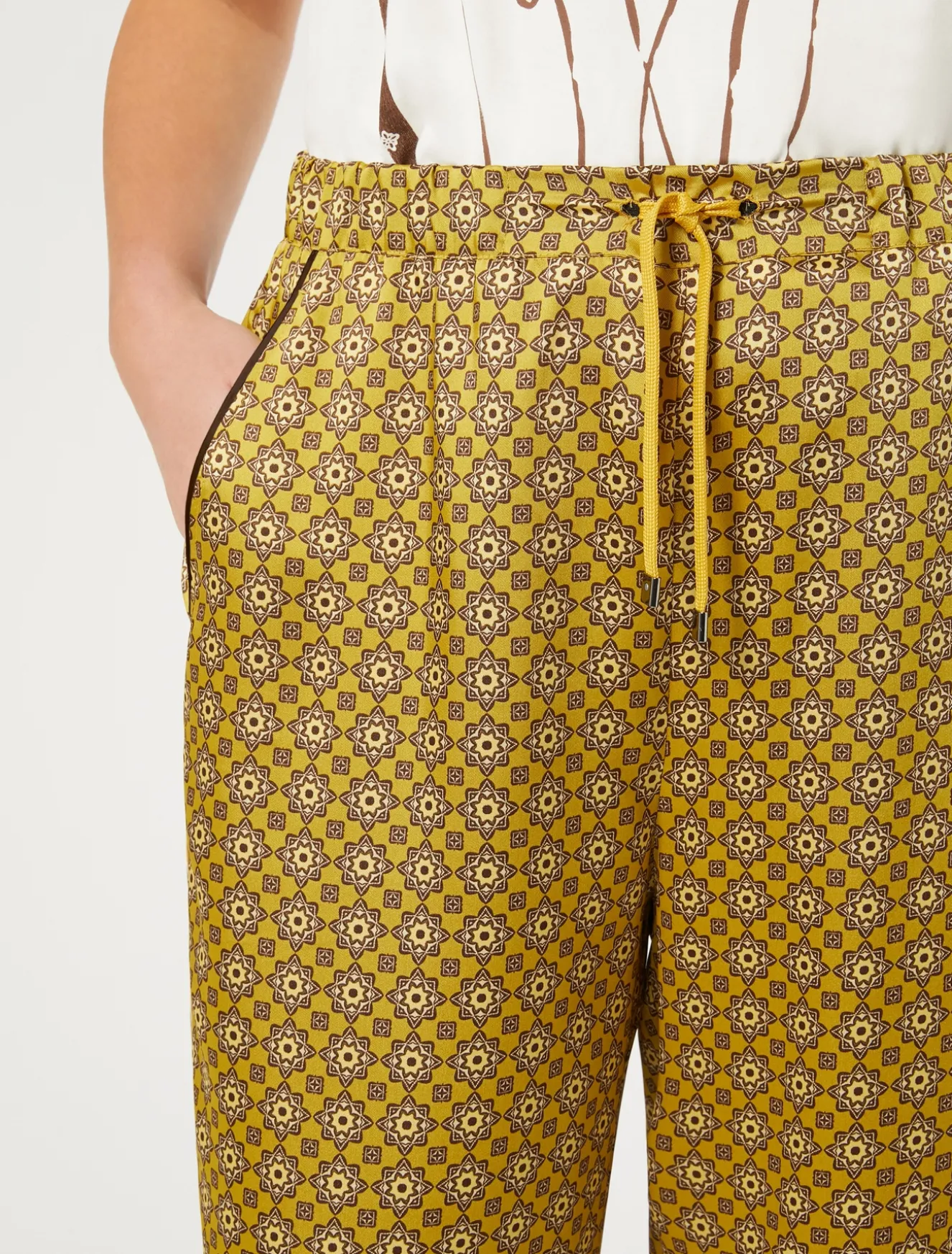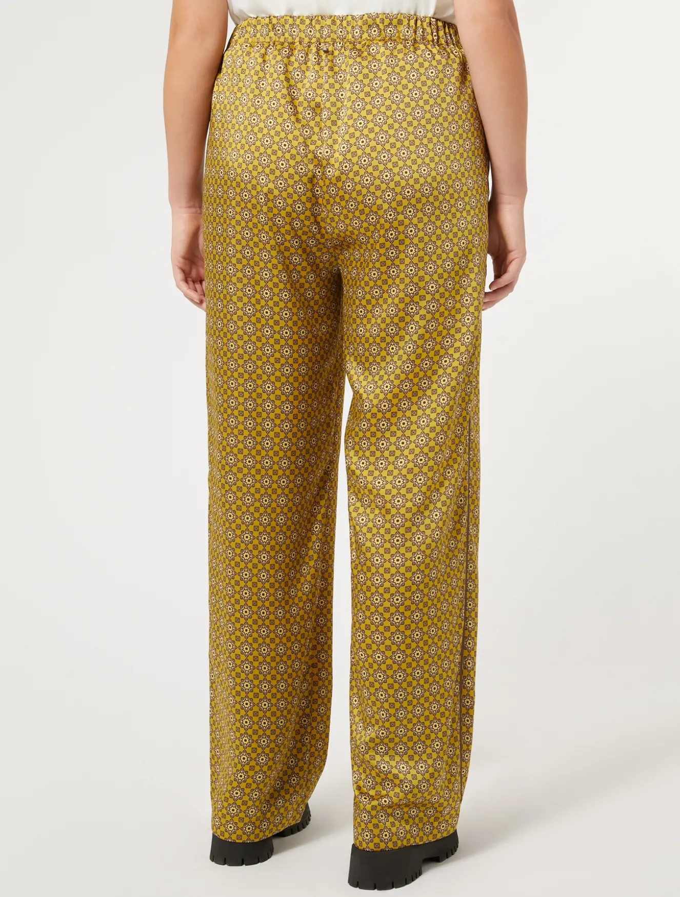 Sono rifiniti da piping in colore a contrasto i pantaloni wide leg in twill con stampa esclusiva. Perfetti per dare una nota grafica allo stile.