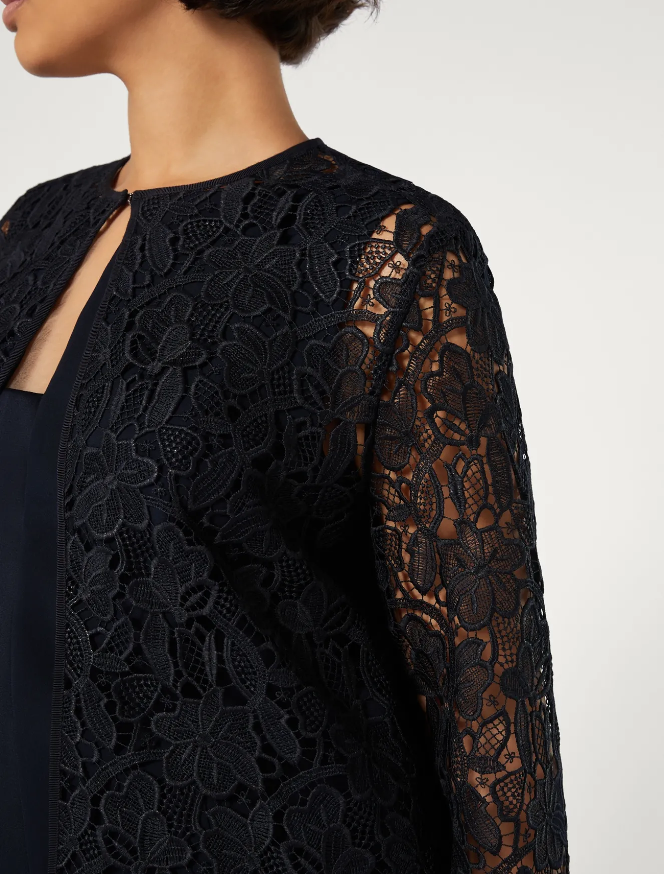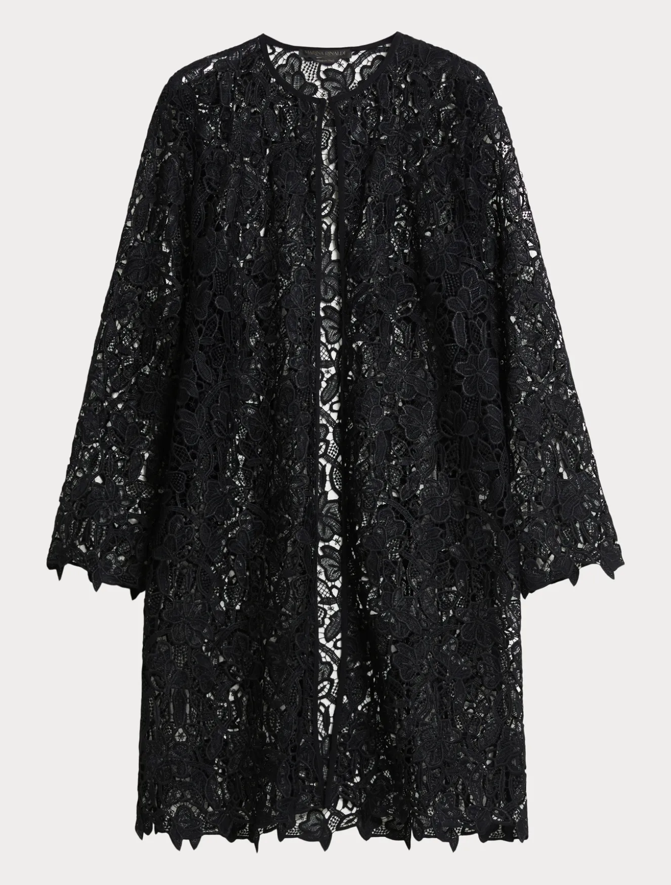 Pizzo macramè laminato ricercato per il soprabito rifinito da gros-grain in tinta e fondi smerlati. Donerà una nota raffinata a tutti i tuoi outfit speciali.Il capo fa parte della collezione Elegante.