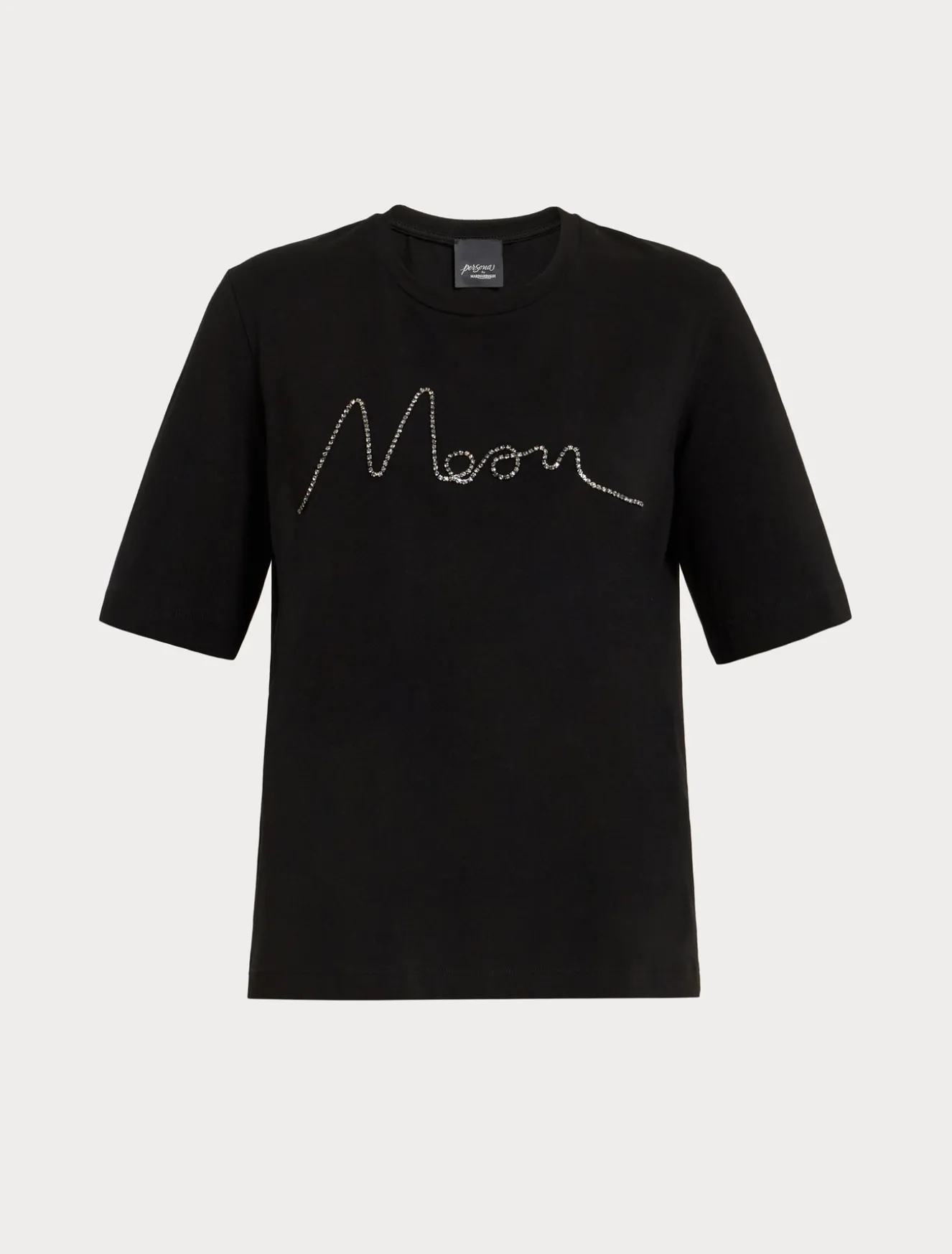 Dettagli glamour per la t-shirt in jersey di cotone stretch con scollo rotondo e maniche corte, personalizzata con stampa o motivo lettering con catenella in strass.Il capo fa parte della collezione Persona by Marina Rinaldi.