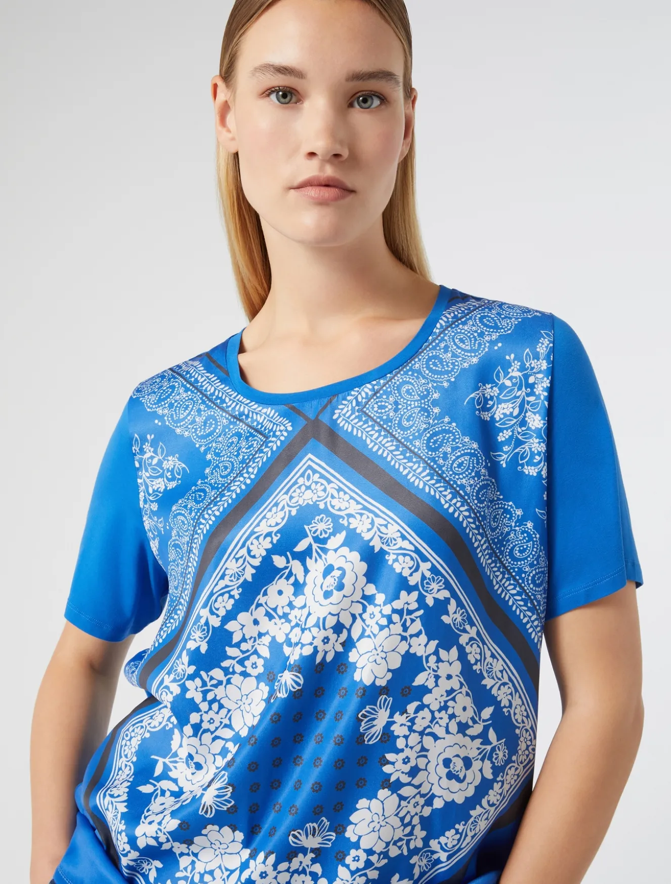 Dai una nota grafica al tuo stile con la T-shirt in jersey di viscosa stretch con tessuto stampato davanti. Perfetta da abbinare a tutto il guardaroba.
