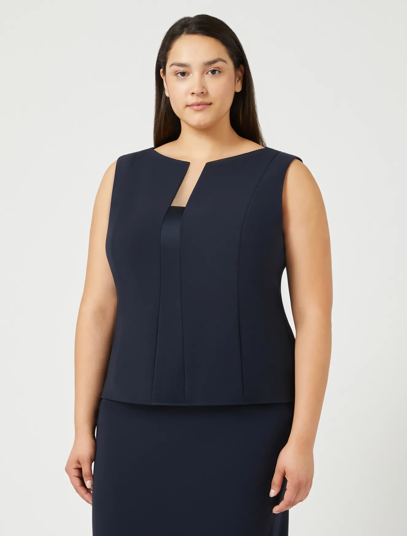 Linea aderente con tagli verticali e intarsio in tessuto lucido al centro per il top in cady triacetato comfort, un tessuto fluido, anti-imperfezioni e di facile manutenzione. Da abbinare alla giacca in coordinato.Il capo fa parte della collezione Elegante.