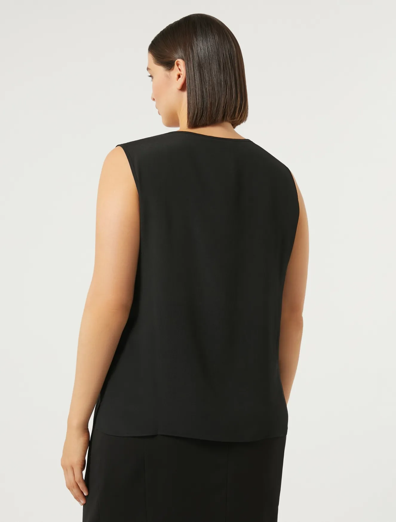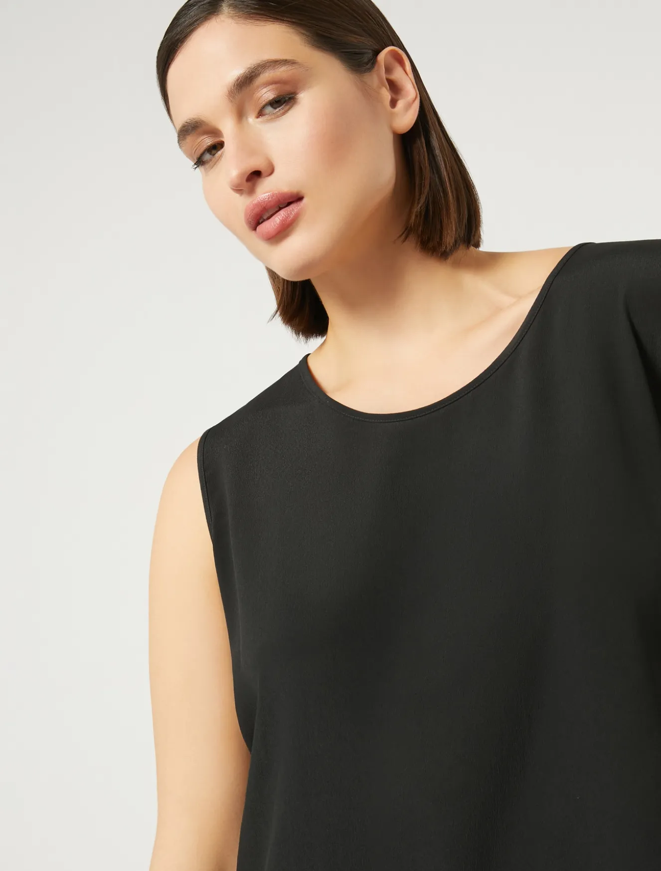 Completa i tuoi look con il top in crêpe de Chine di misto seta, dalla linea dritta. Puoi applicare le maniche corte con un intervento di sartoria dedicato. Il tessuto principale contiene materie prime derivanti dalla cellulosa del legno, fibra ricavata nel rispetto del patrimonio forestale.