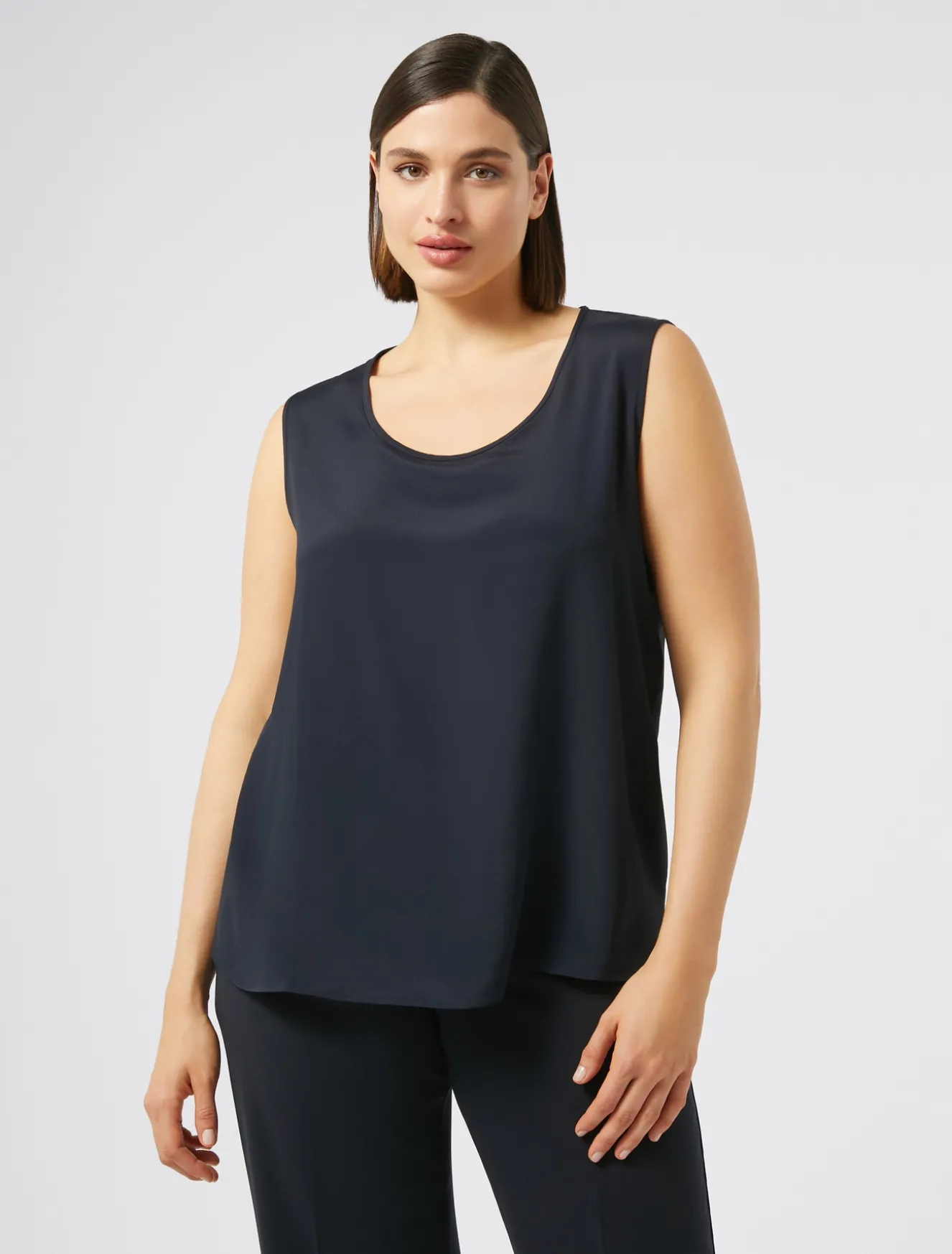 Completa i tuoi look con il top in crêpe de Chine di misto seta, dalla linea dritta. Puoi applicare le maniche corte con un intervento di sartoria dedicato. Il tessuto principale contiene materie prime derivanti dalla cellulosa del legno, fibra ricavata nel rispetto del patrimonio forestale.