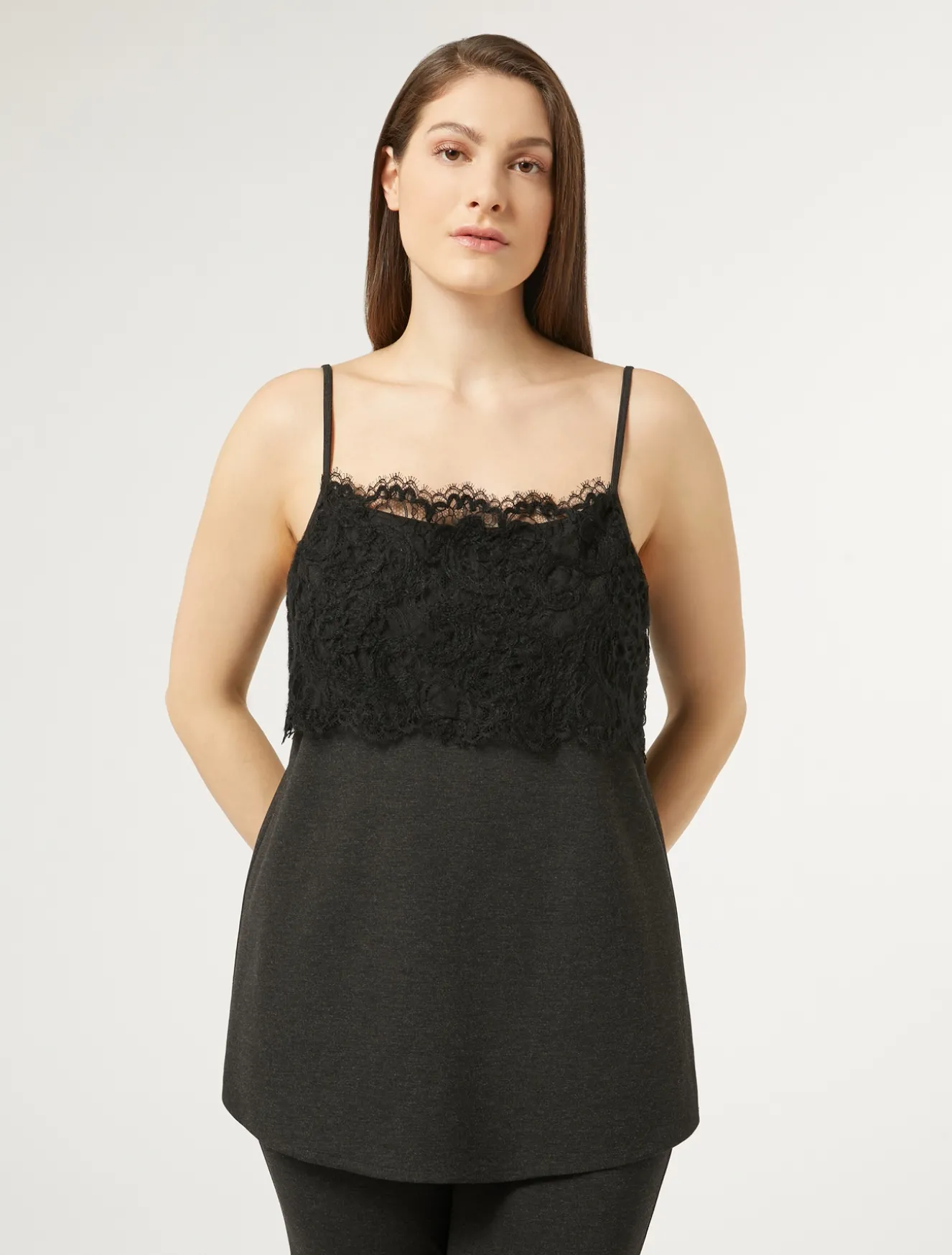 È realizzato in morbido jersey e pizzo Chantilly ricamato in lana confortevole il top sottoveste con spalline ampie in dotazione. Sotto giacche e cardigan per completare lo stile.Il capo fa parte della main collection Marina Rinaldi.