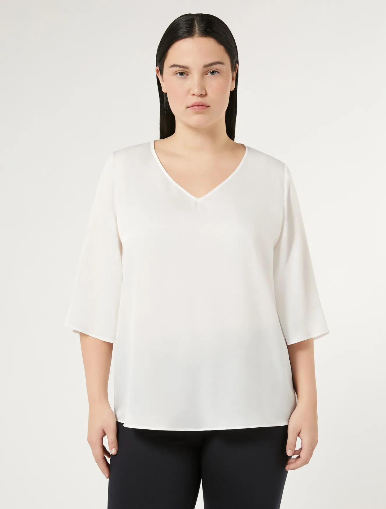 Texture sofisticate per il top in raso con scollo a V e maniche corte. Puoi indossarlo per il dailywear o come capo passe-partout per un look più elegante.Il capo fa parte della collezione Persona by Marina Rinaldi.