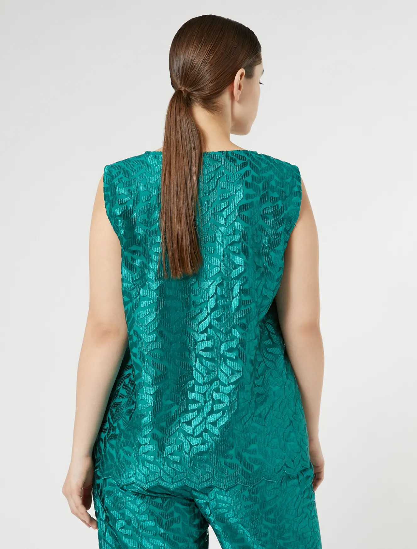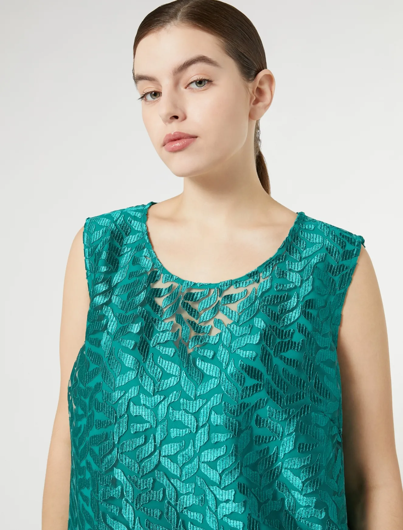 Dettagli romantici per il top in tulle ricamato con disegno a foglia stilizzata. Ha le maniche che possono essere applicate con un semplice intervento di sartoria dedicato. Gli orli smerlati impreziosiscono il capo con un tocco leggero e raffinato. Il capo fa parte della collezione Persona by Marina Rinaldi.