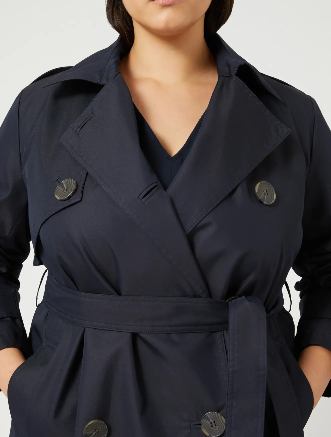 Vero key item del guardaroba, questo trench impermeabile in cotone e nylon è costruito con bavolette agganciata con bottone davanti e libera sul retro. Lo puoi regolare in vita con la cintura in coordinato. Il capo fa parte della main collection Marina Rinaldi.