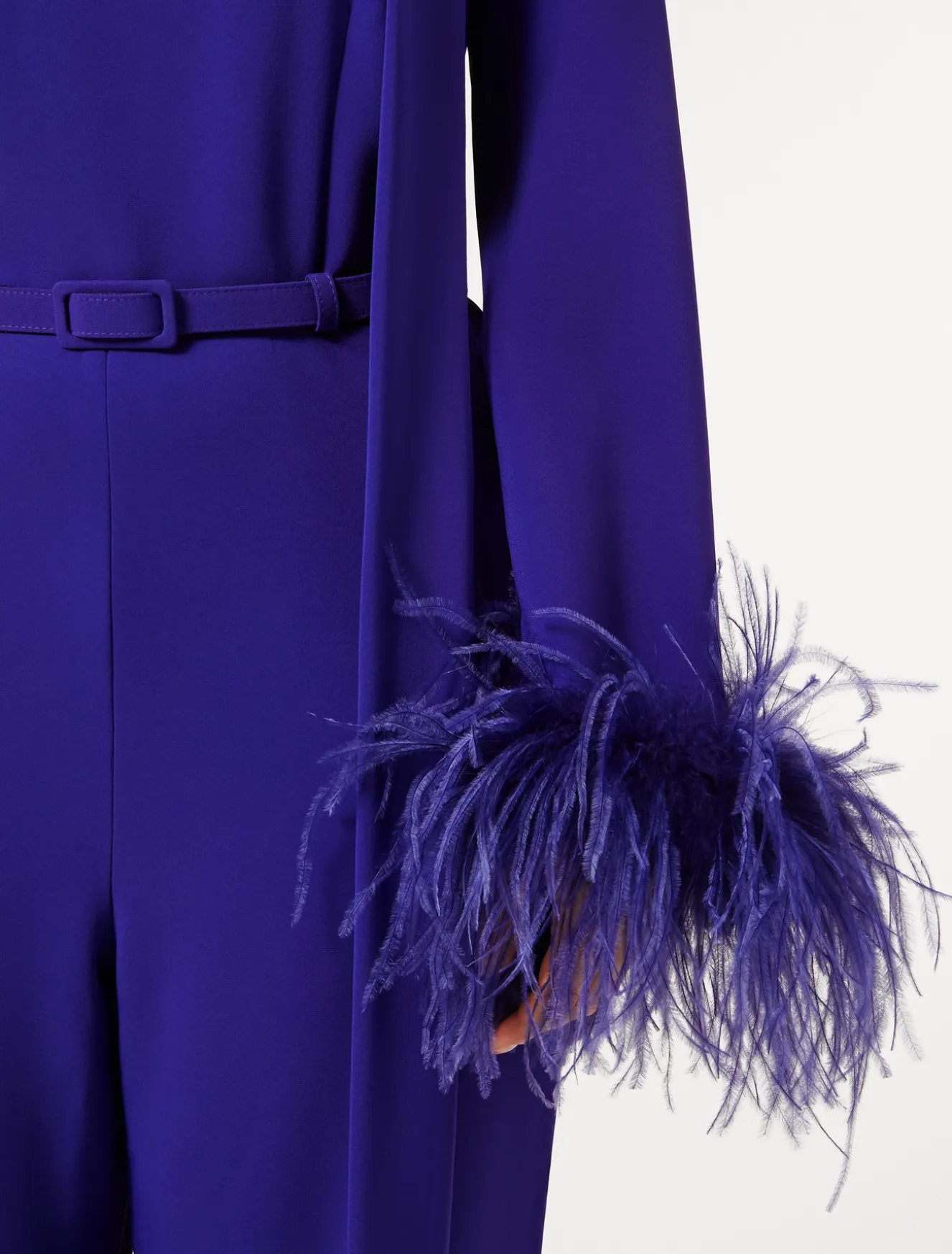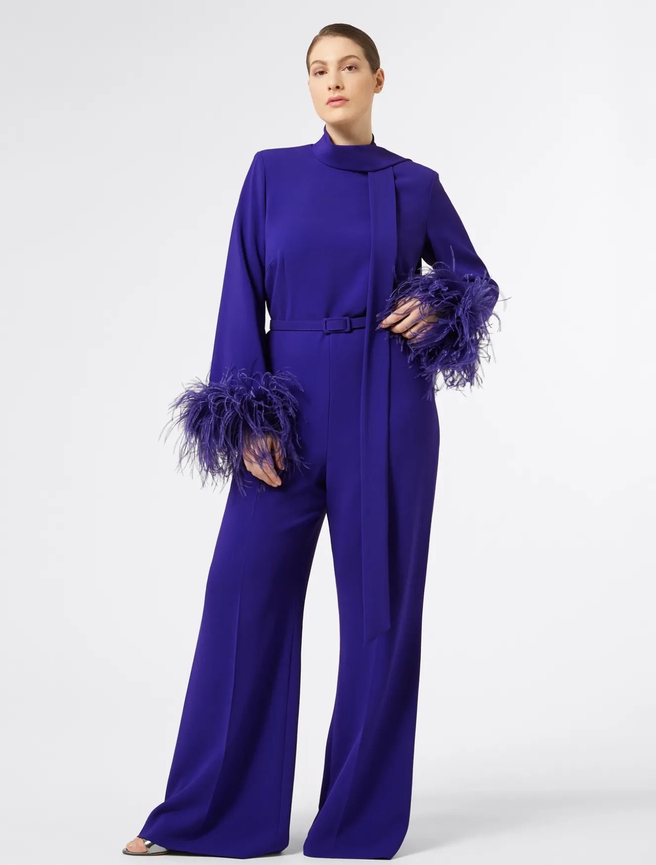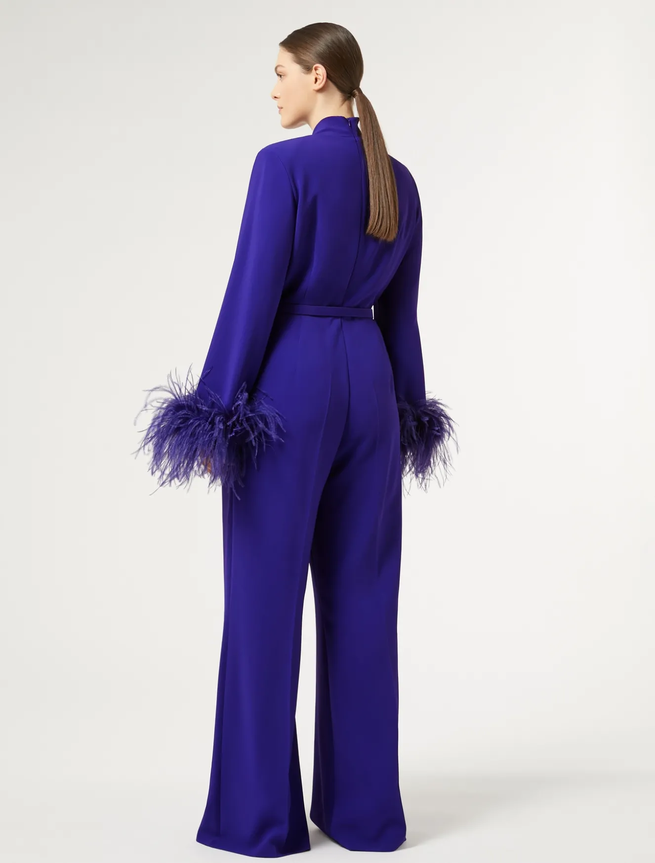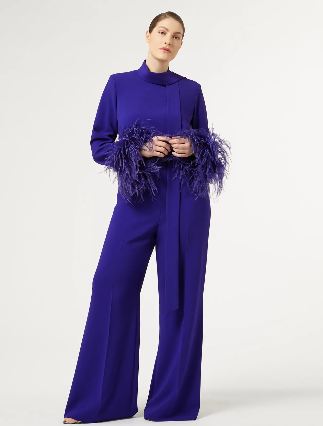 Tuta dalla silhouette raffinata e rifinita ai polsi da applicazioni di lunghe piume in tinta applicate a mano. Spalle strutturate e nastri al collo da annodare.Il capo fa parte della Capsule by Zuhair Murad.