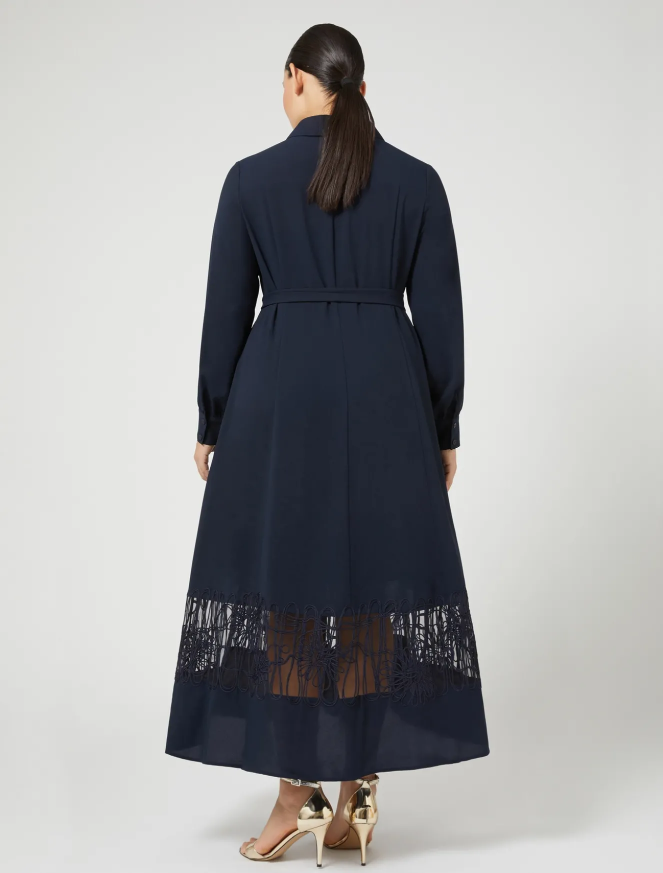 Ricamo cornely su tulle al carré e intarsiato al fondo per l’abito lungo chemisier in crêpe leggero. Lavorazione preziosa per un modello sofisticato da sfoggiare nelle occasioni speciali.Il capo fa parte della collezione Elegante.