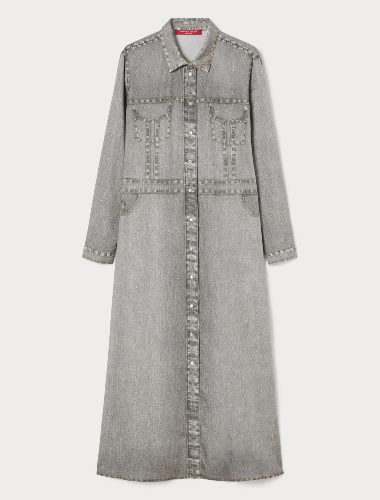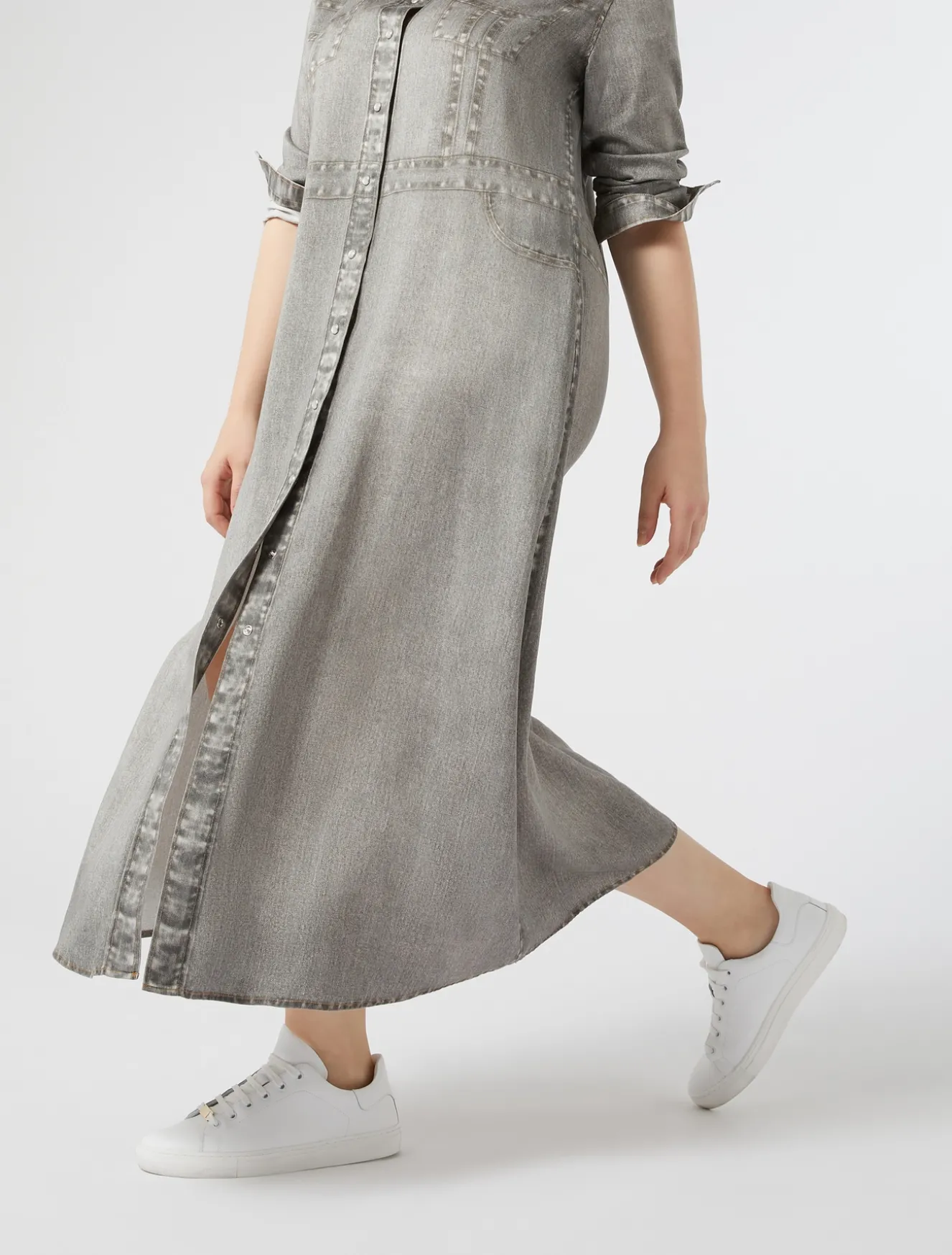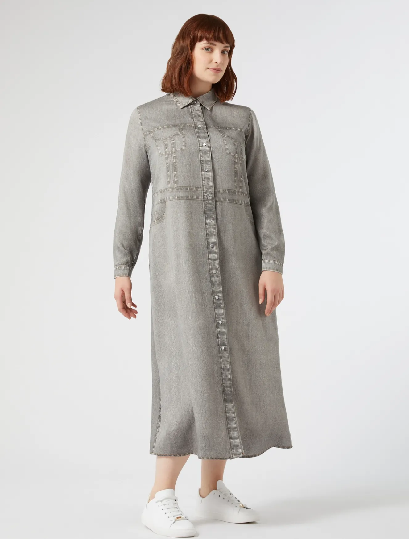 Stampa effetto denim per l’abito chemisier in raso di lyocell che riproduce le tasche e il carré davanti e dietro tipico del jeans. Tessuto ricercato e design inedito per look che non passano inosservati.