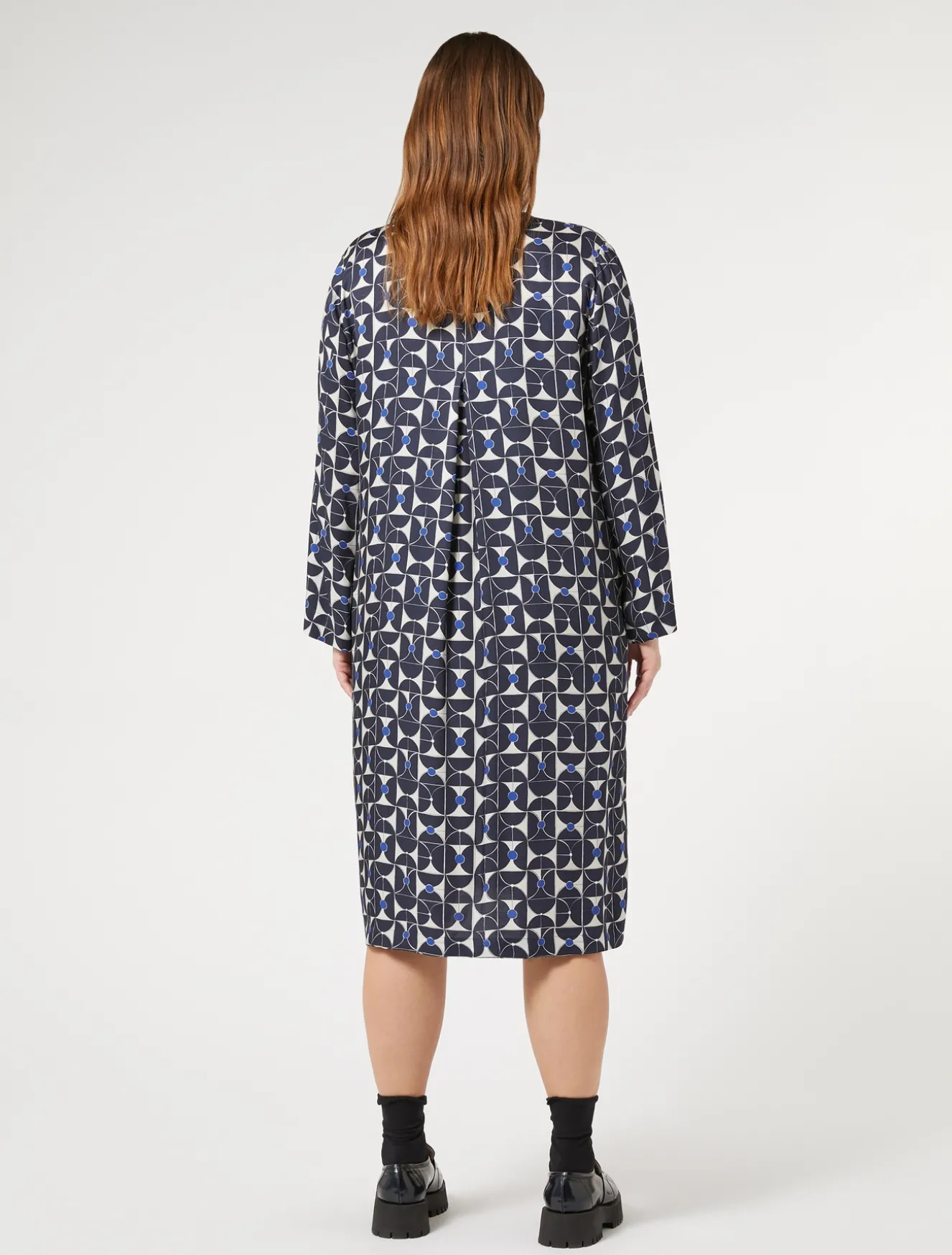 Stampa grafica esclusiva per l’abito chemisier in twill di viscosa, dalla linea svasata con contropiega sul retro. Lo puoi indossare con la fusciacca in coordinato da annodare al collo o in vita.Il capo fa parte della collezione Voyage.