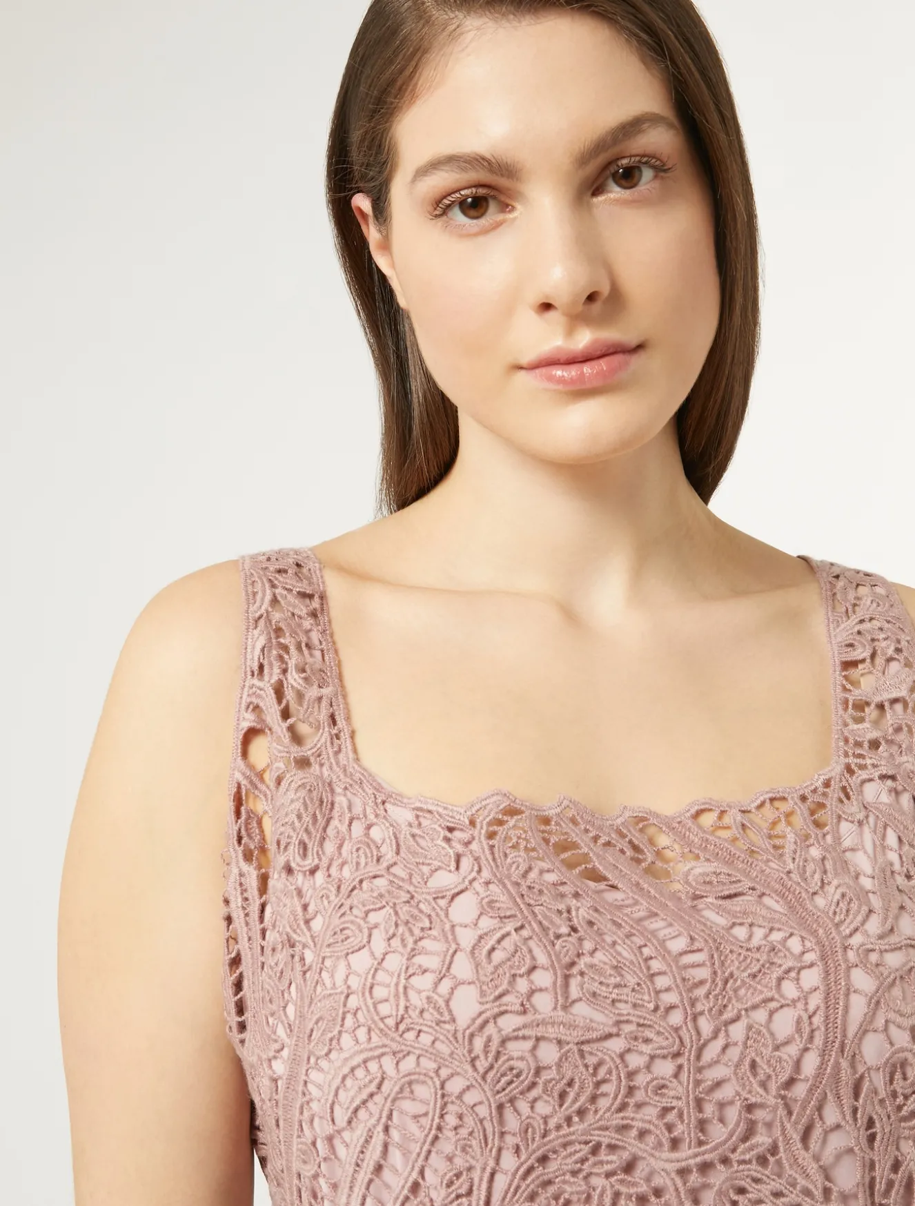 Lavorazione tessuto macramè con disegno esclusivo per l’abito di linea semiaderente con ricamo effetto macramè. Collo e giromaniche sono stati tessuti seguendo il design del modello. Perfetta per sfoggiare uno stile che non passerà inosservato, anche in abbinamento al cardigan in coordinato.Il capo fa parte della main collection Marina Rinaldi.