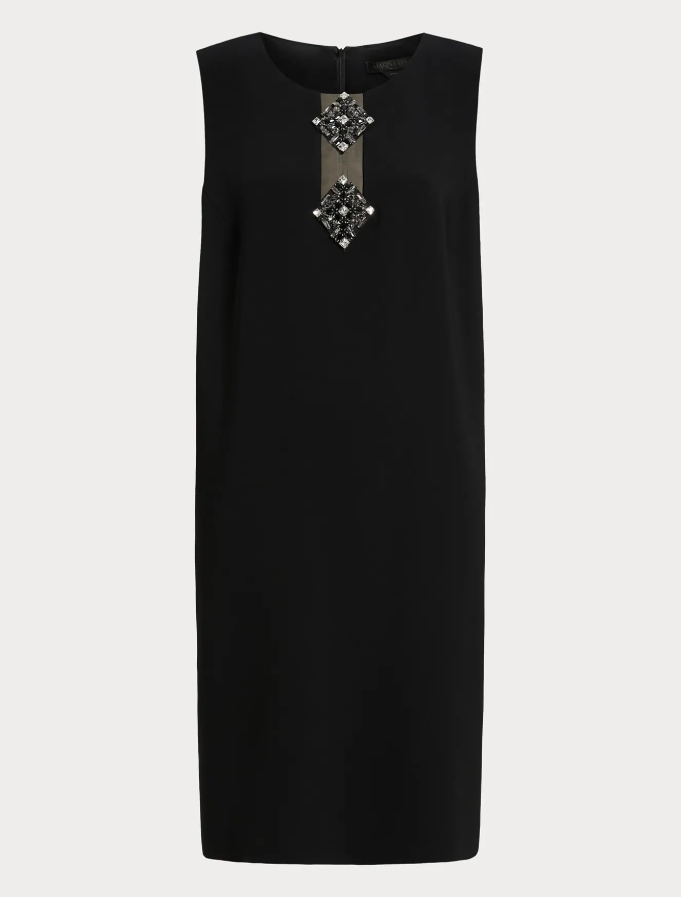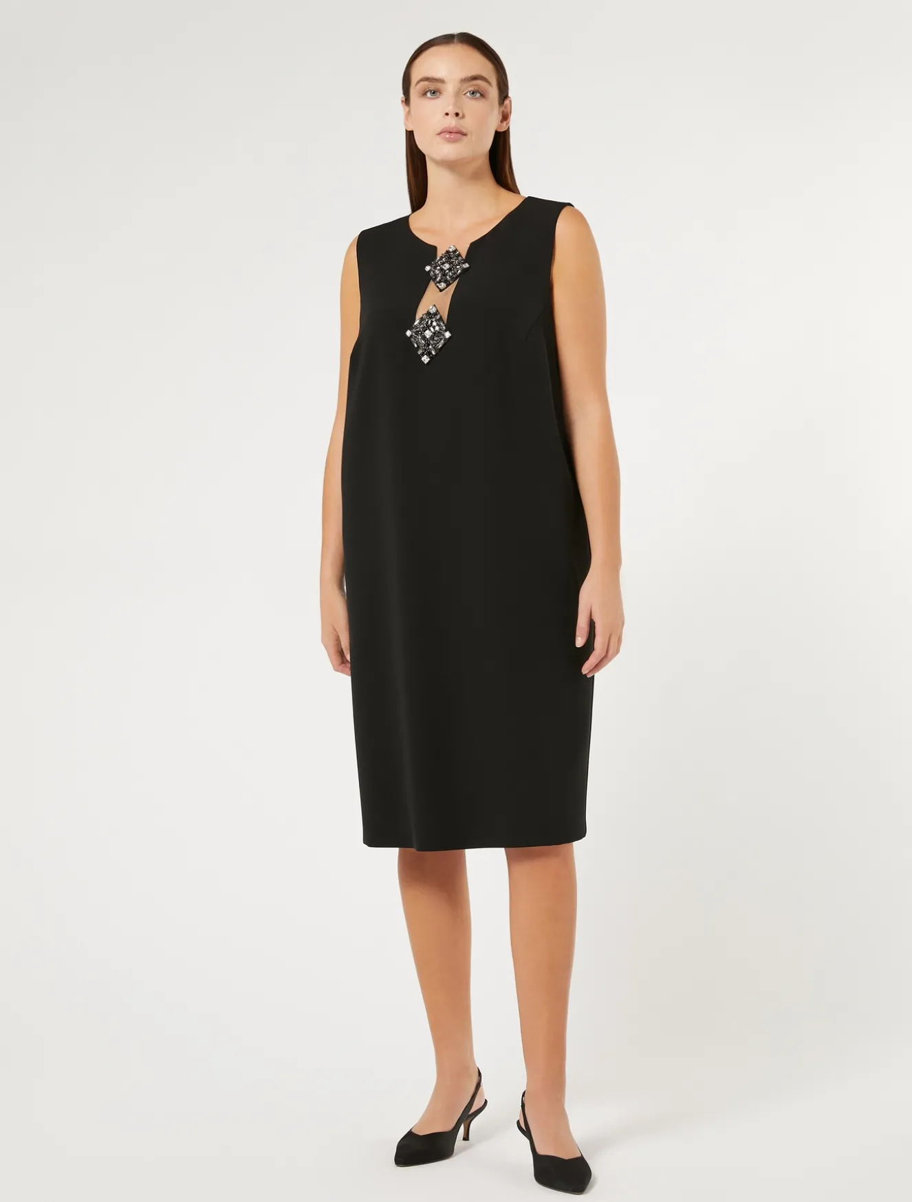 È impreziosito da un’applicazione ricamata a mano di strass e perline metalliche l’abito in cady triacetato, un tessuto fluido, di facile manutenzione e anti-imperfezioni. Puoi applicare al modello le maniche lunghe con un semplice intervento di sartoria.Il capo fa parte della collezione Elegante.