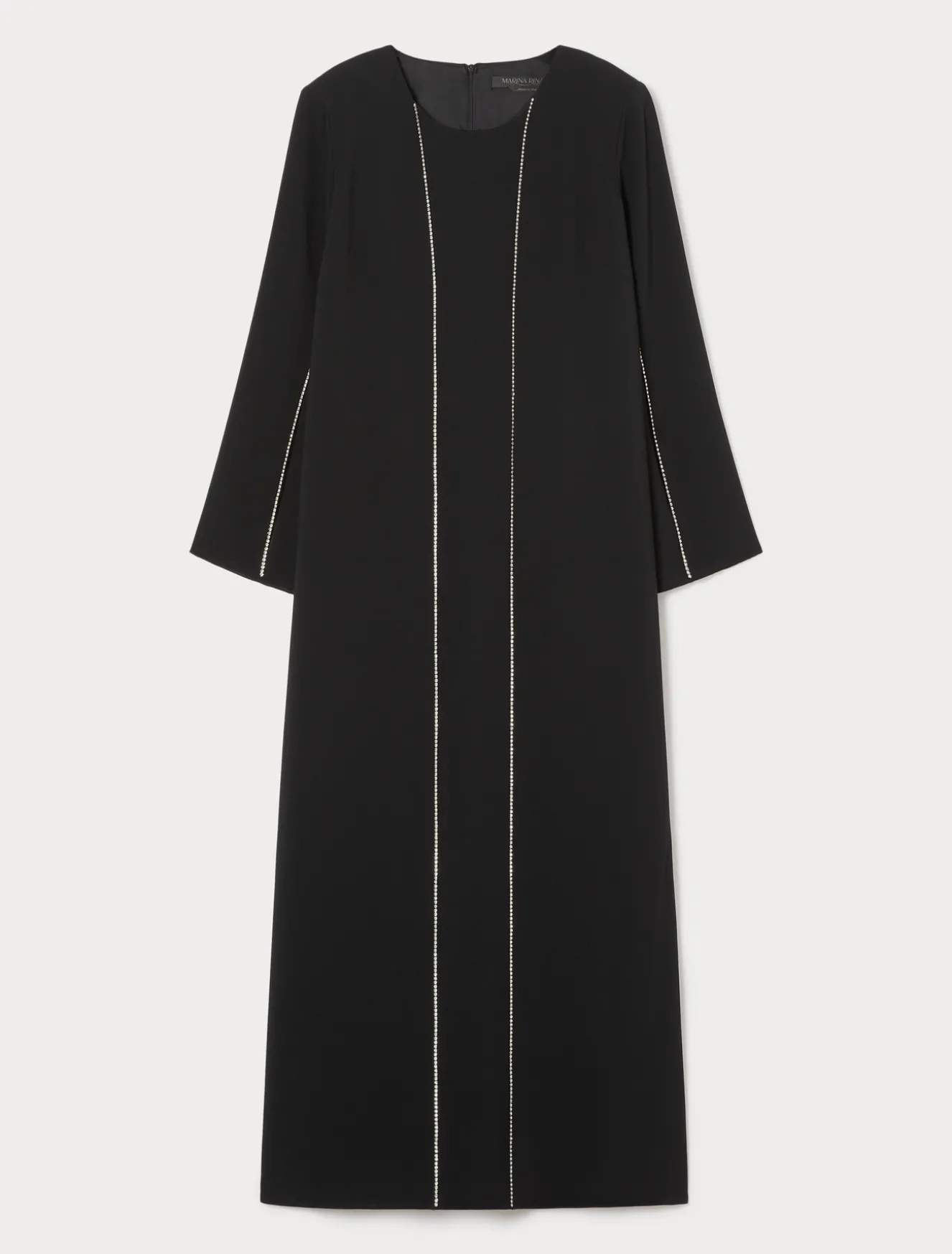 L’abito in cady triacetato è impreziosito da passamanerie gioiello che definiscono i tagli verticali e le maniche, per un effetto soprabito.