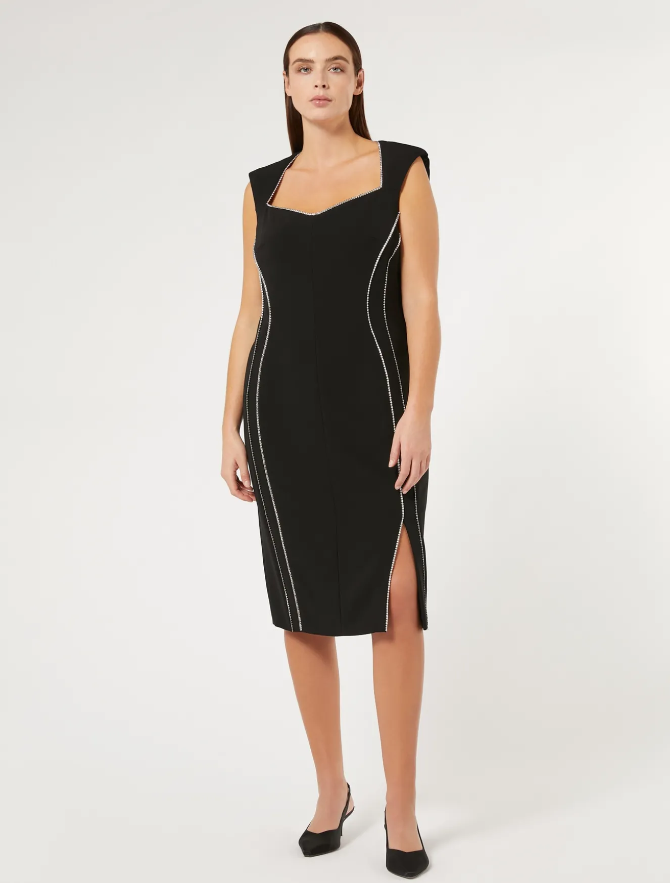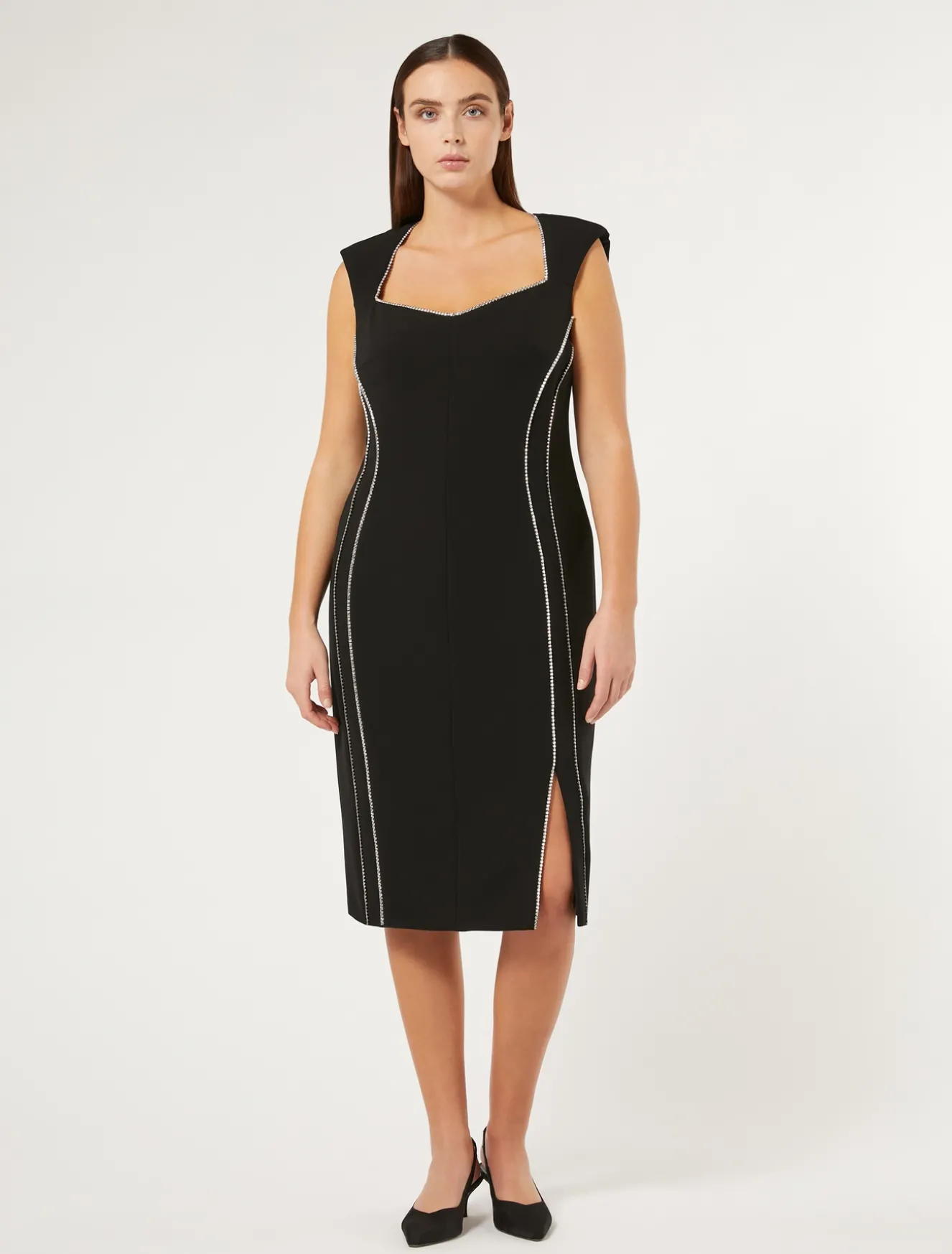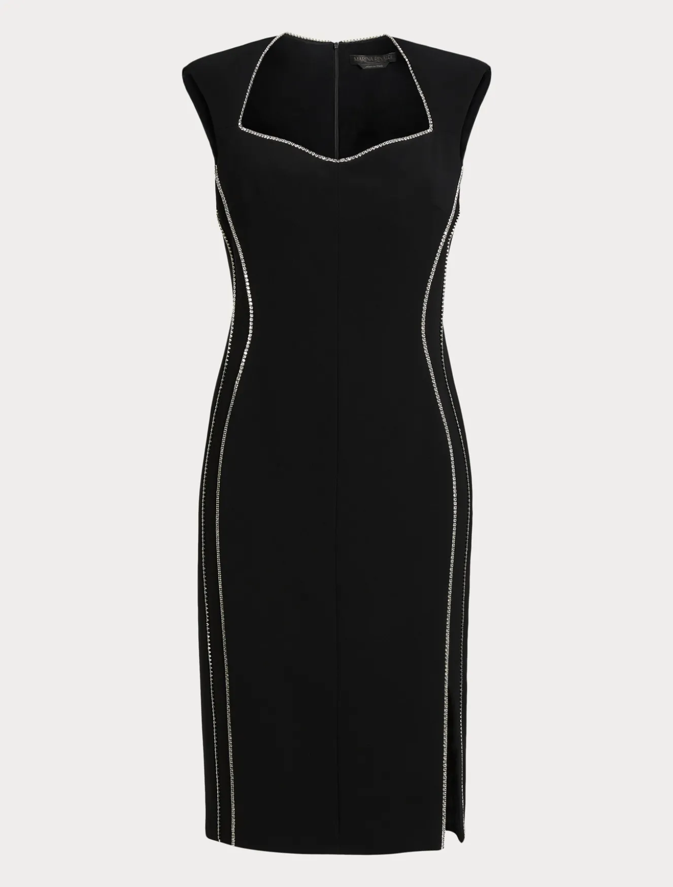 È rifinito da dettagli di piping in strass crystal l’abito a tubino in cady triacetato, un tessuto fluido, di facile manutenzione e anti-imperfezioni. È costruito con tagli verticali davanti e dietro, per una silhouette accostata al corpo. Indossalo con il blazer in coordinato.Il capo fa parte della collezione Elegante.