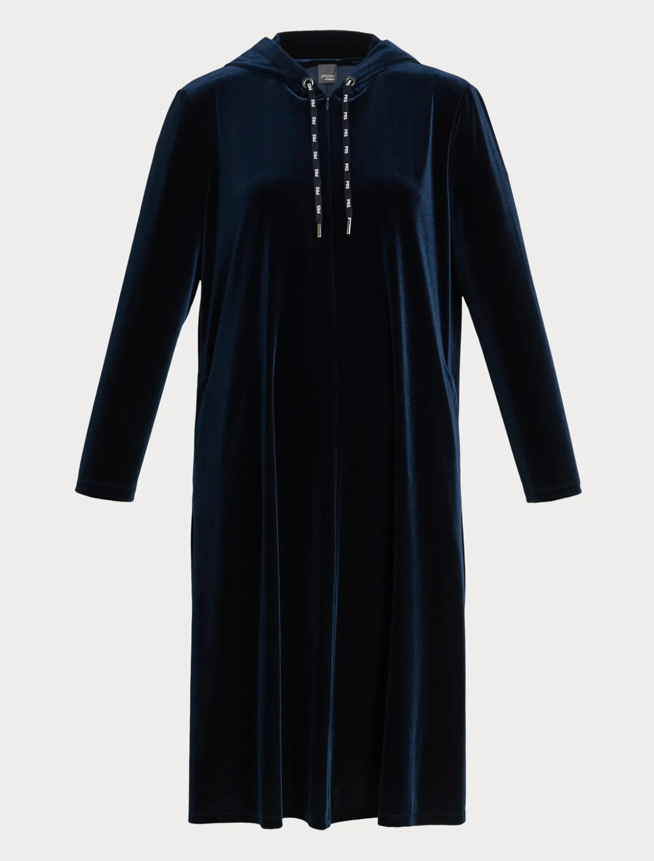 Attitudine sporty-chic per l’abito in ciniglia stretch con cappuccio e coulisse personalizzata, maniche lunghe, tasche inserite nei fianchi. Il capo fa parte della collezione Persona by Marina Rinaldi.