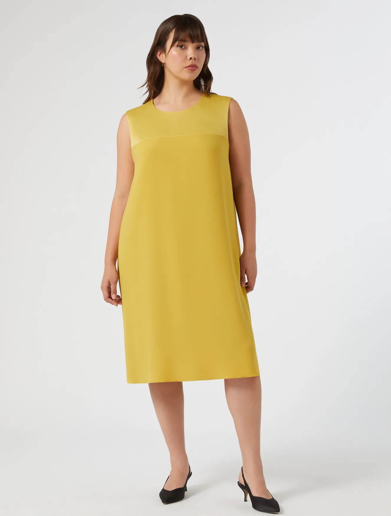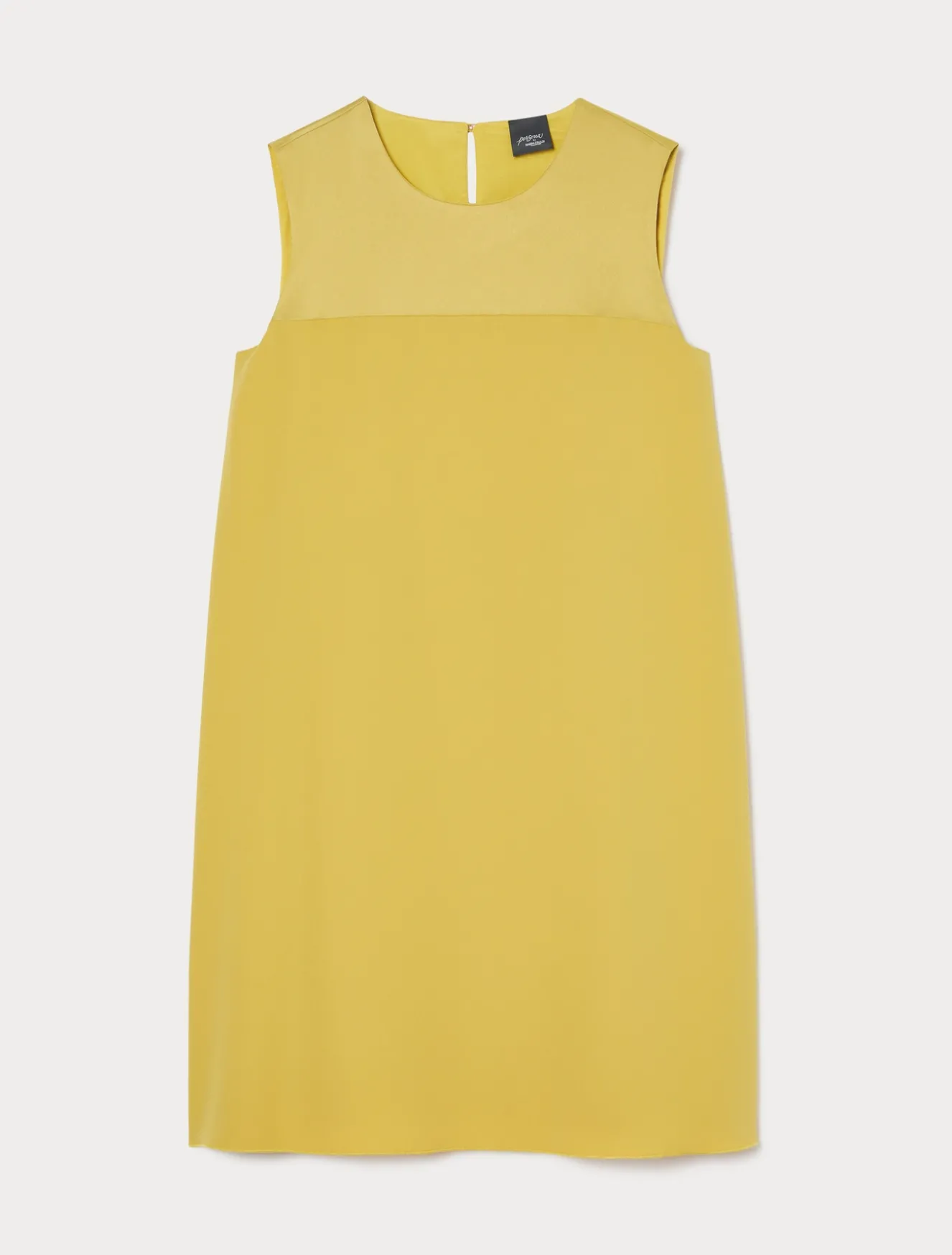 Giochi di lucido e opaco per l’abito A-line in crêpe envers satin, con carré e fianchi in tessuto lucido. Puoi applicare le maniche corte in dotazione con un semplice intervento di sartoria dedicato.