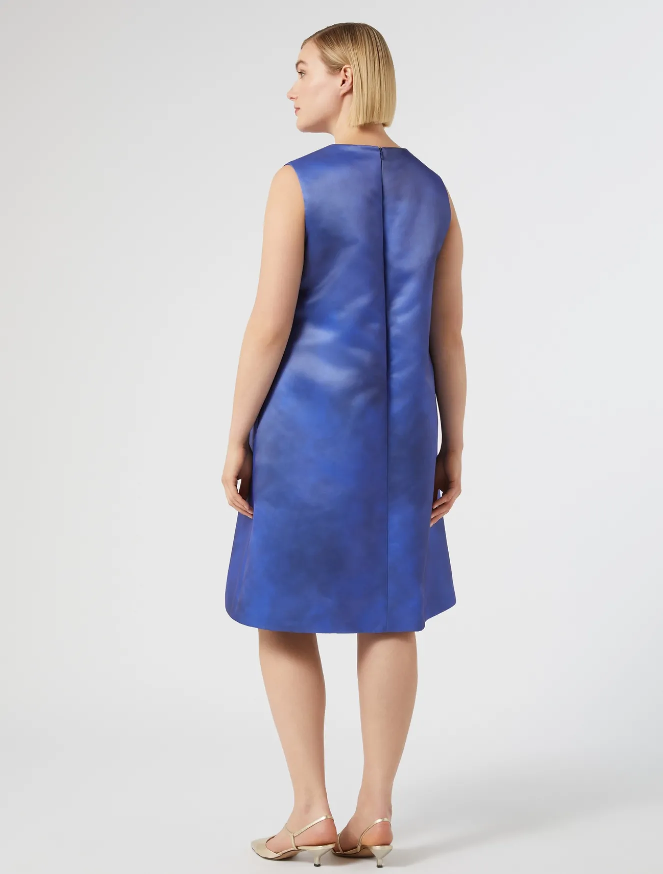 Stampa piazzata a fiore per l’abito in duchesse, dalla linea ad A. Puoi applicare le maniche corte in dotazione con un semplice intervento di sartoria dedicato.