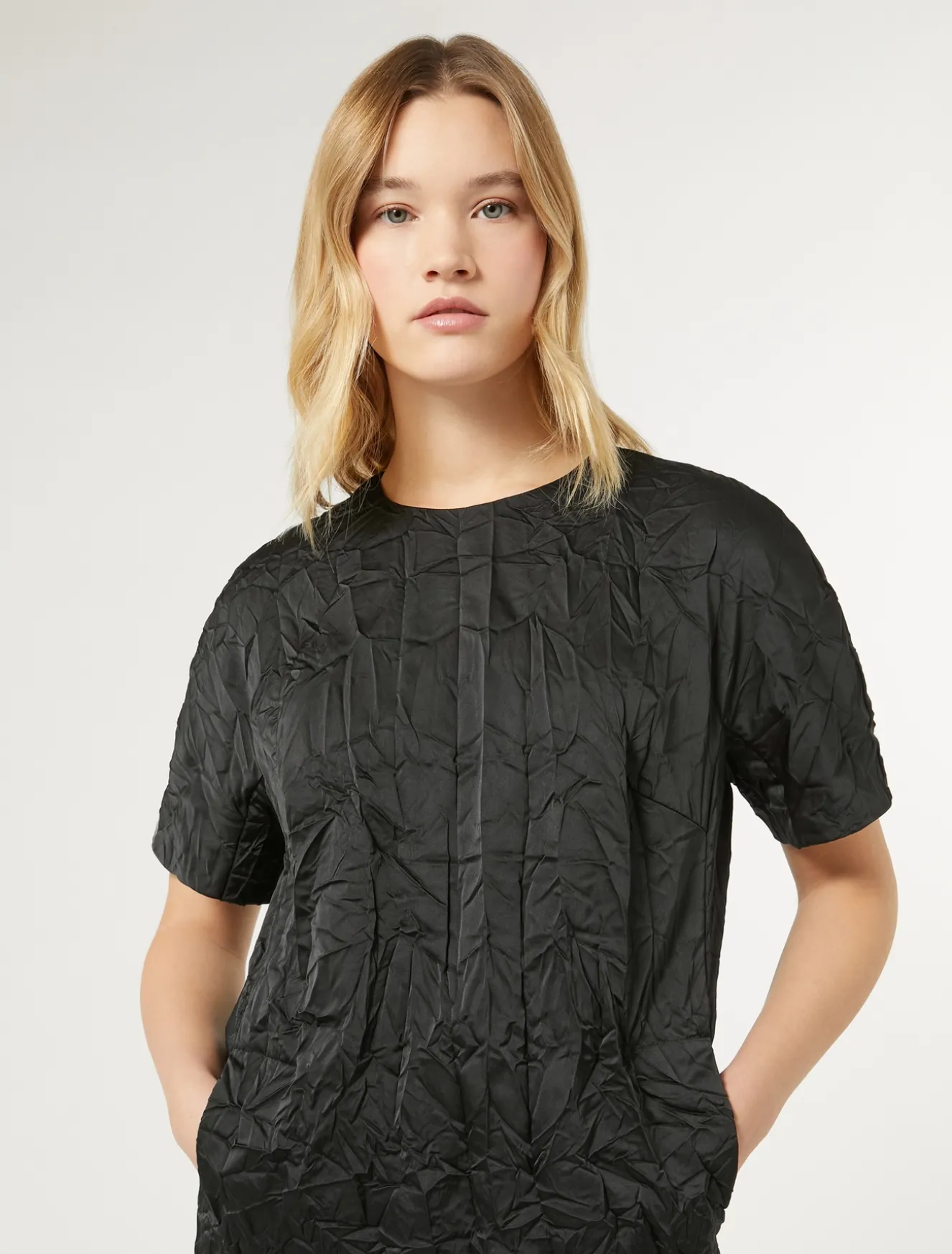 Texture ricercata per l’abito in duchesse effetto stropicciato, dalla linea dritta. Design essenziale e raffinato perfetto per un’occasione speciale.Il capo fa parte della main collection Marina Rinaldi.