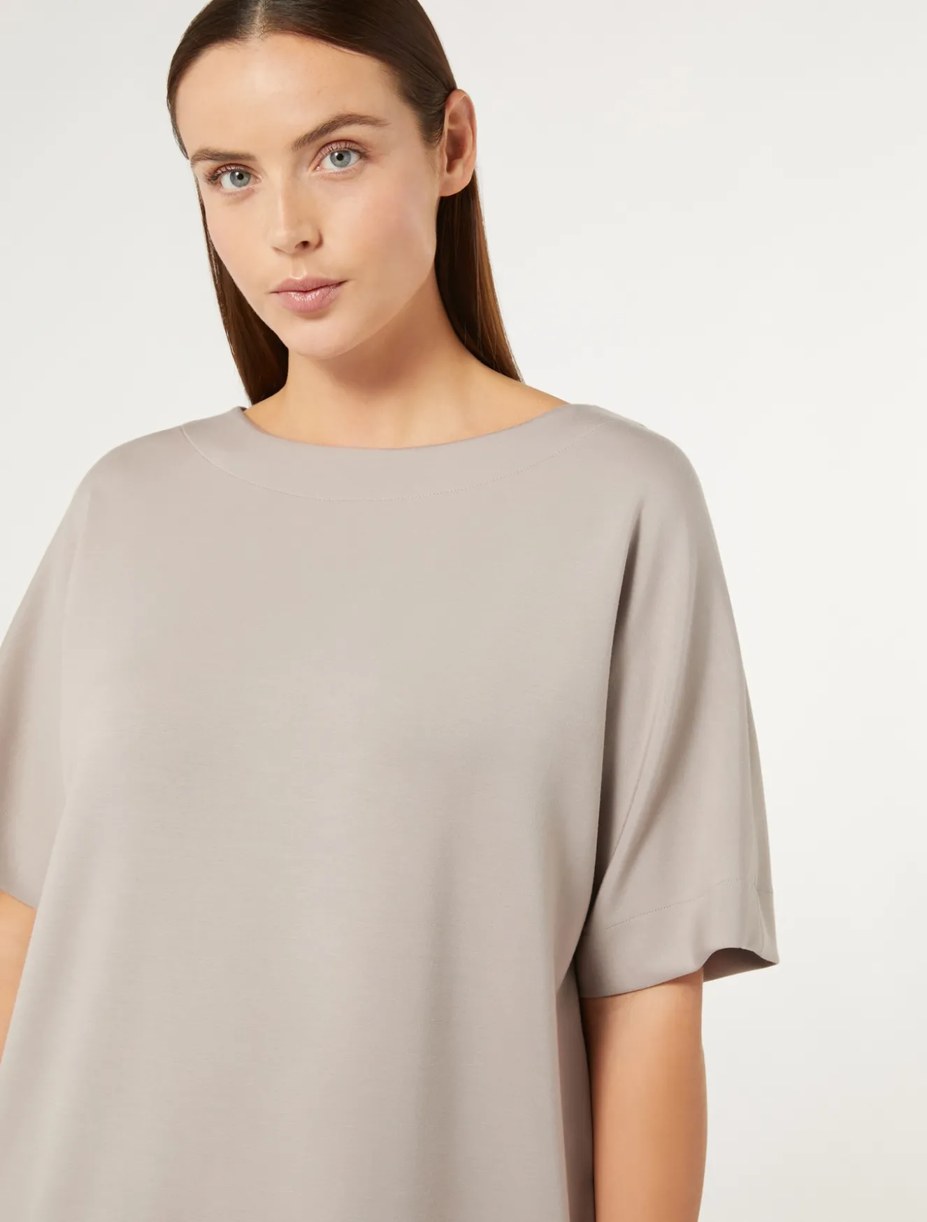 Linea cozy a uovo per l’abito in jersey double di misto viscosa, dalla mano morbida, con maniche a kimono. Pratico ed essenziale per tutti i giorni.Il capo fa parte della collezione Marina Sport.